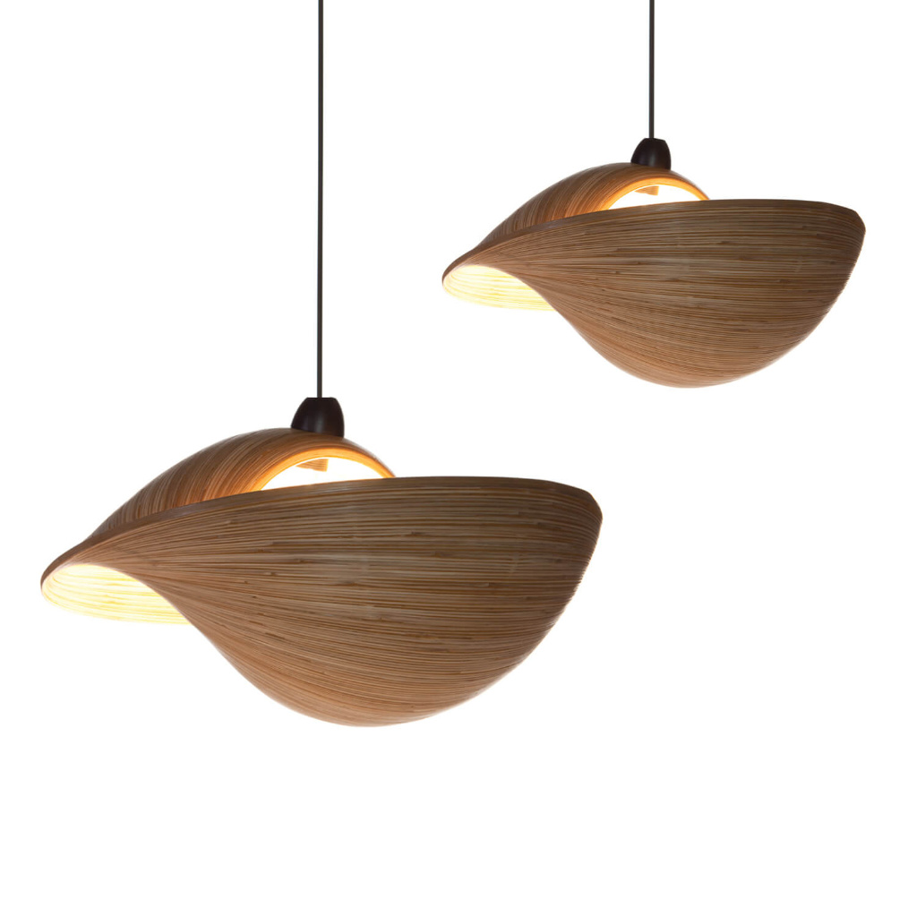 Een sierlijke hanglamp, gemaakt uit bamboe, dat kunstig is verlijmd in een vorm die doet denken aan een mooie schelp zoals je ze kunt vinden op een tropisch strand. Vandaar de naam "Shell".