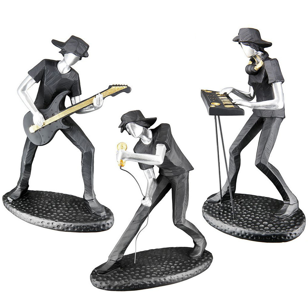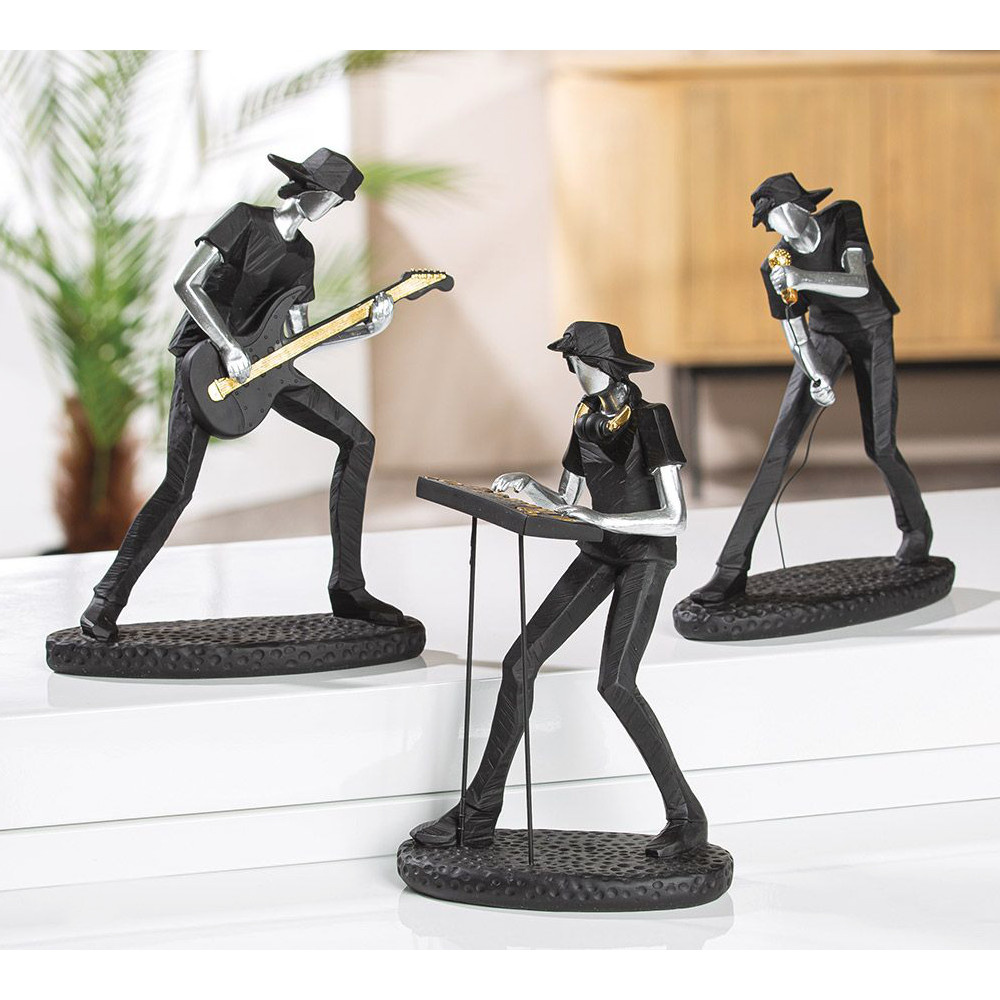 Eigentijdse beelden set van een 3-delige rockband. Bestaande uit een gitarist of bassist, een toetsenist of pianist en een zanger. Het trio, gestoken in bijpassende mat zwarte kleding, is voorzien van accenten in zilver en goud. Een sfeervolle set die elke muzikant zal aanspreken. Maar ook een opvallende aanvulling voor de verzameling van iedere muziekliefhebber.