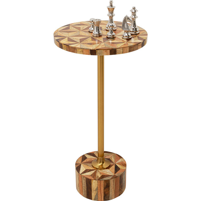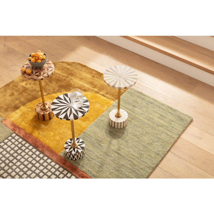 Op zijn grafisch ontworpen tafelblad met geometrisch motief, biedt dit salontafeltje naast een loungestoel of bank ruimte voor uw mobiele telefoon met een kopje thee. De kleine bijzettafel van hout, metaal en gietsteen maakt niet alleen indruk door zijn praktische gebruik, maar ook door zijn visuele uitstraling. Het is een schitterend decoratief object en zodoende een echte blikvanger! Je kunt hem bijvoorbeeld gebruiken in een smalle gang naast de deur of kapstok voor je sleutels. Of als mooie bloementafel voor je favoriete kamerplant.