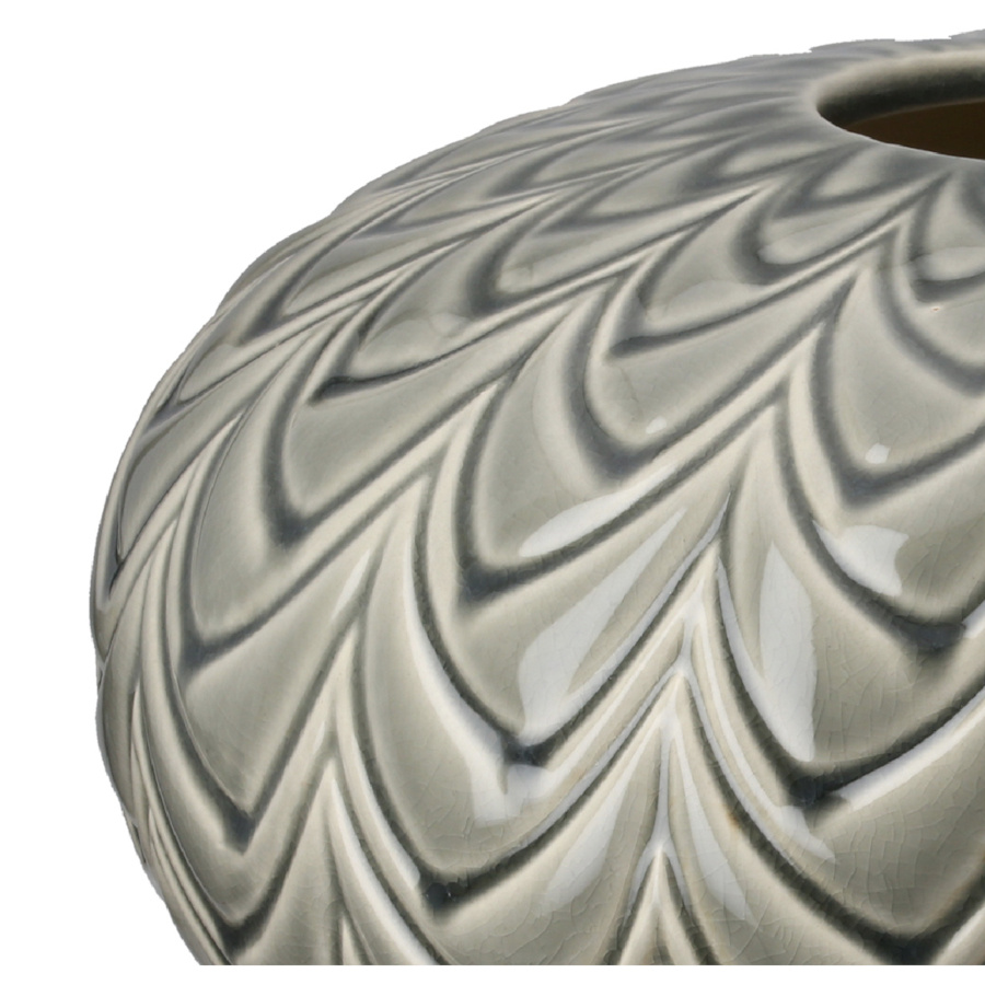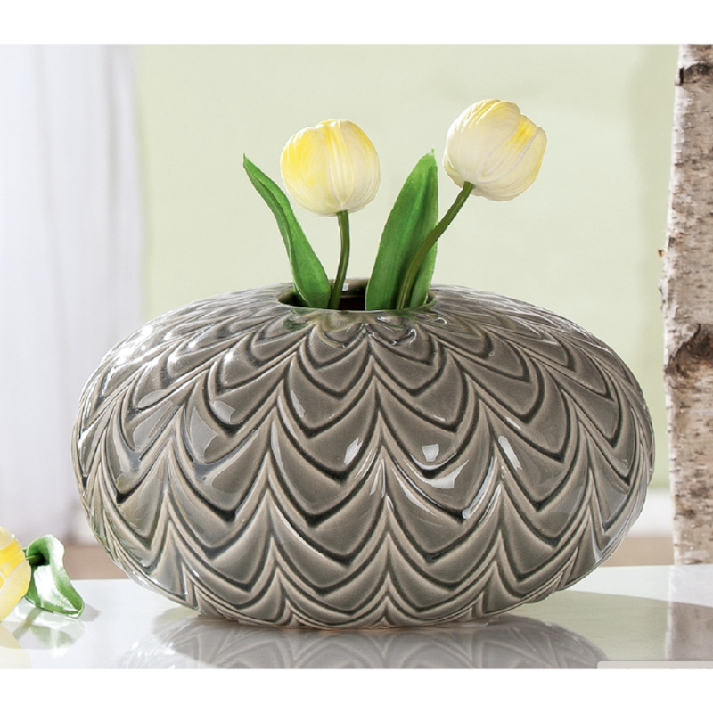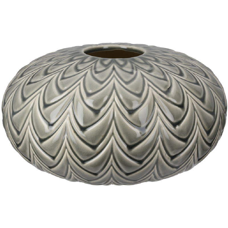 Decoratieve keramieken vaas uit de Lamello serie van het Duitse merk Gilde. Met een luxe uitstraling uitgevoerd in een donker grijs/groene kleur met artistieke vormen in de bol vaas verwerkt. Zeer decoratieve vaas voor op de eettafel, dressoir of kookeiland door zijn lage, brede vorm.