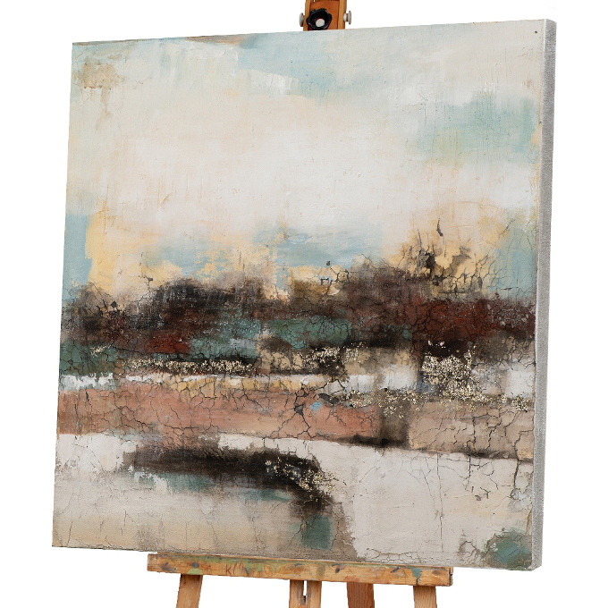 Modern schilderij met een abstract herfstlandschap in aardetinten en glinsterende goudeffecten van goudfolie voor een heel bijzondere glans. De stijlvol aangebrachte craquelé structuur gecombineerd met de goudkleurige delen geeft dit acrylschilderij een elegant karakter!