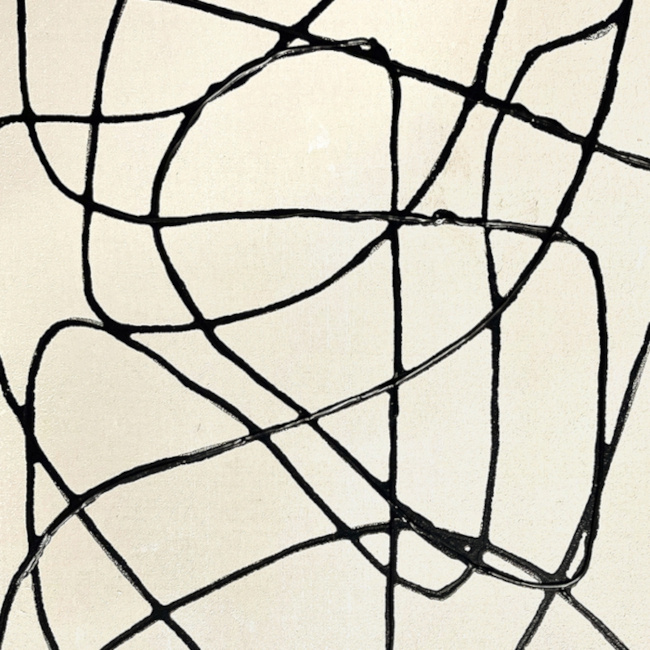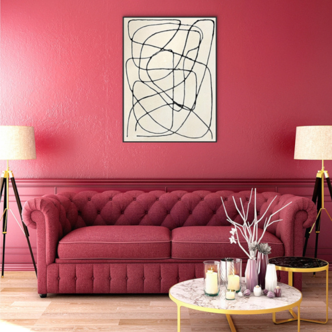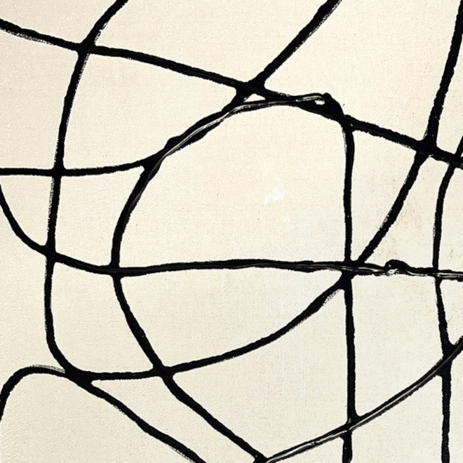Abstract schilderij met een zwarte houten lijst. Met de hand uitgevoerd in acryl op linnendoek afgewerkt met een crèmewitte achtergrond en sierlijke zwarte lijnen. Het geheel zorgt voor een decoratief kunstwerk. Sfeervol en met een eigen stijl. Dit werk past in elk modern interieur.