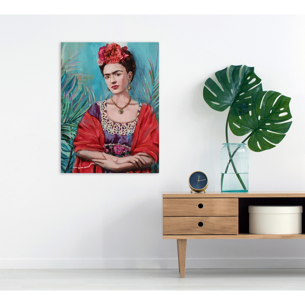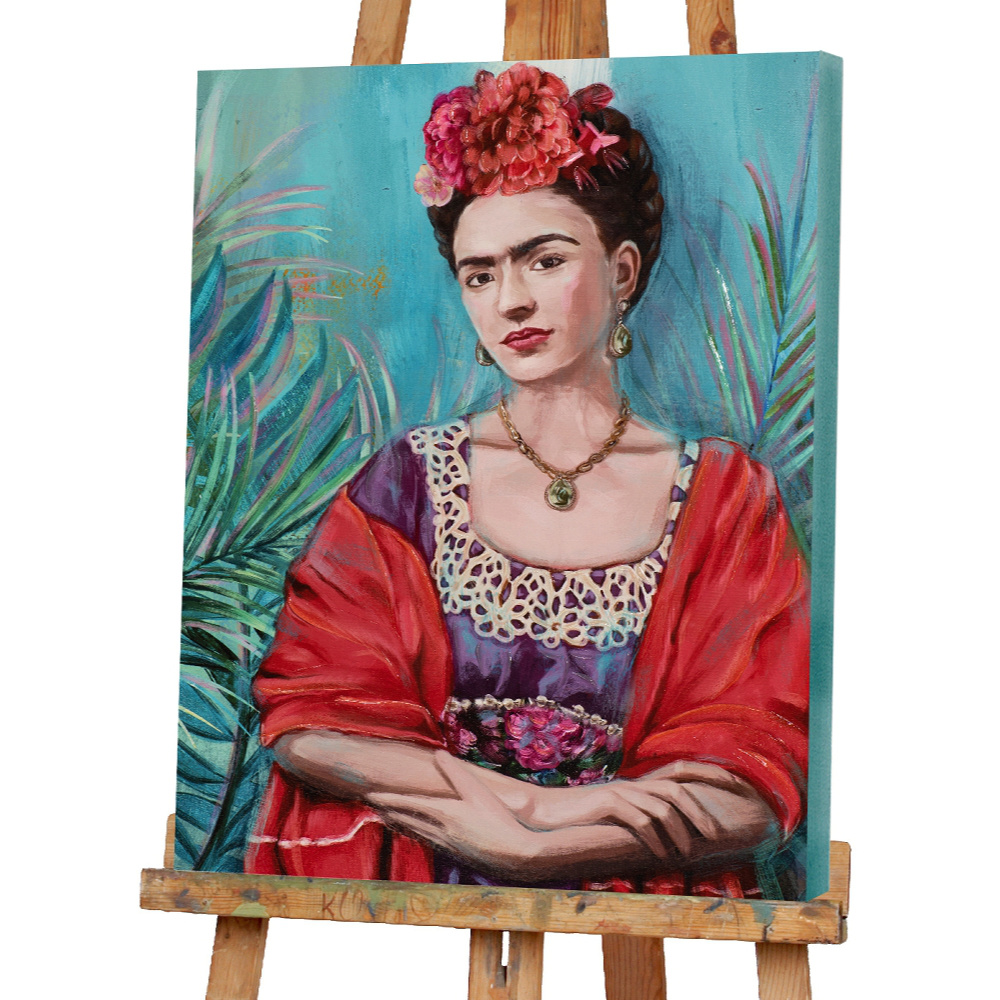Modern schilderij van een dame in prachtige, op elkaar afgestemde, kleurtinten. Uitgevoerd met verschillende technieken in acryl op linnen, bespannen op houten frame. Op sommige delen voorzien van veel verf, op andere delen weer beduidend minder. Met de hand gemaakt, sprekend en kleurrijk, vanwege zijn afmeting is er voor dit portret overal wel een plaatsje te vinden.