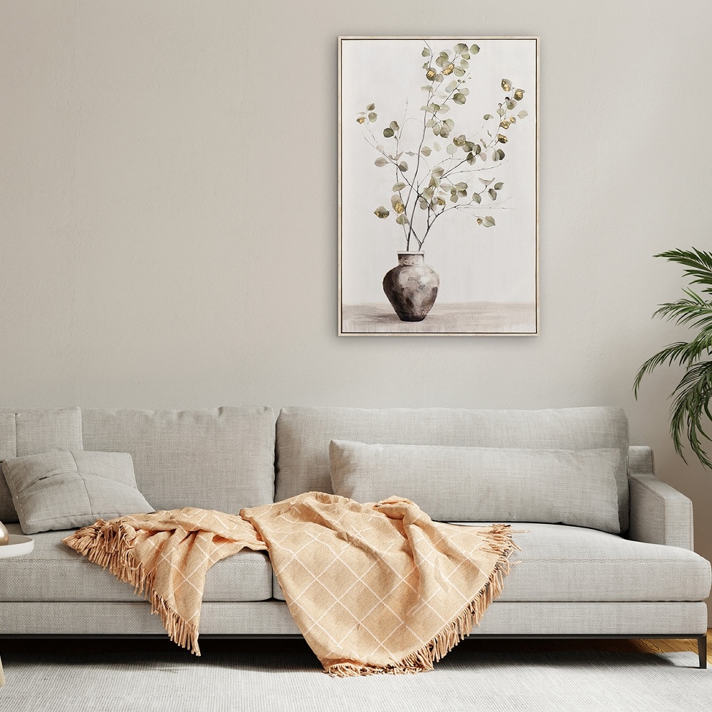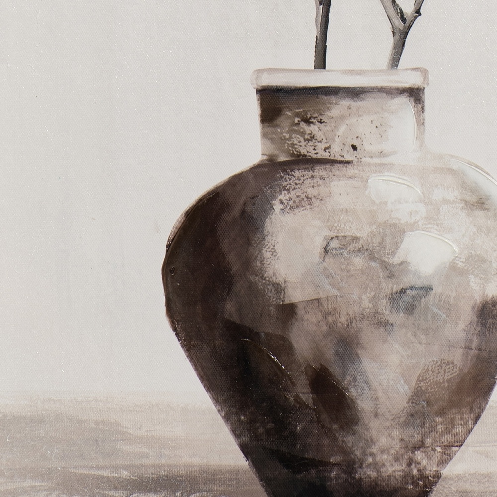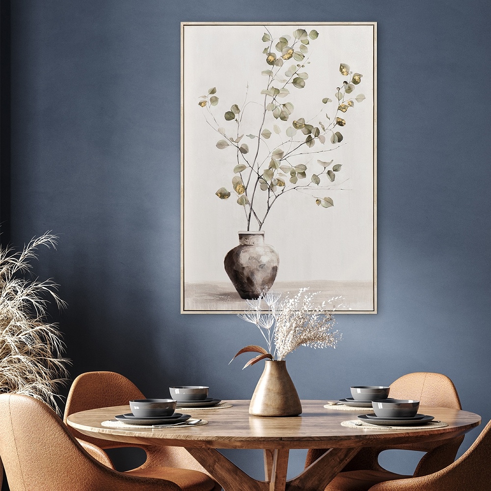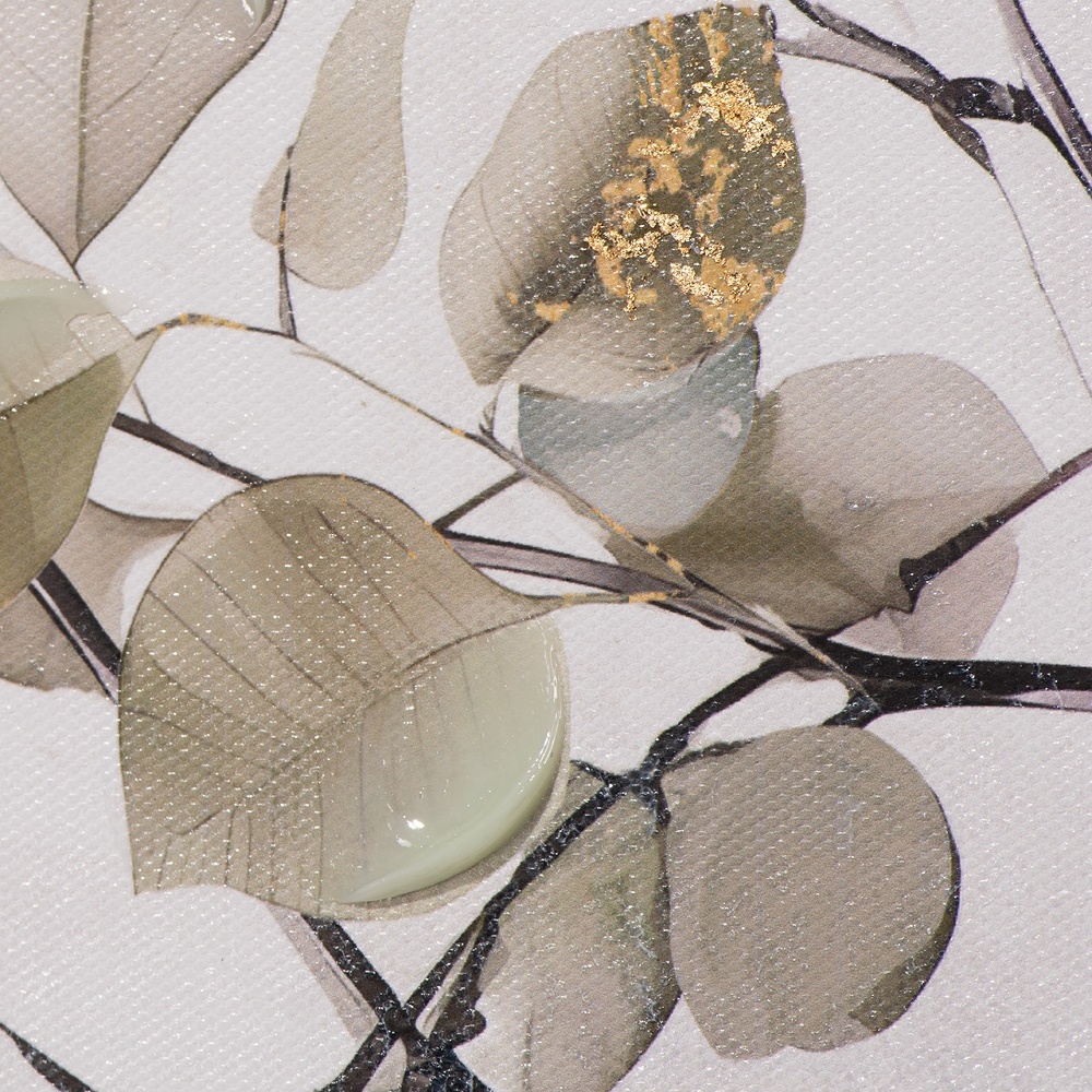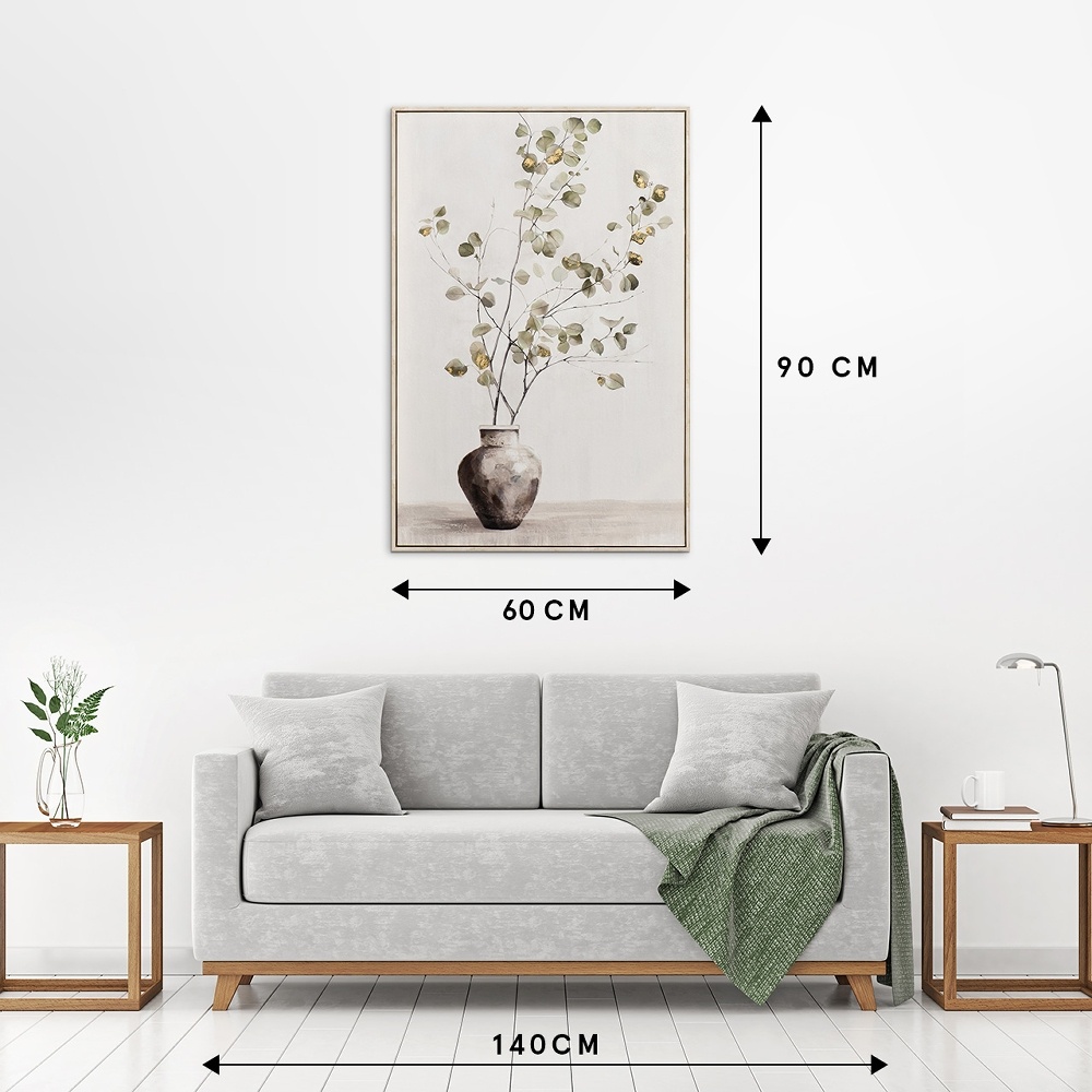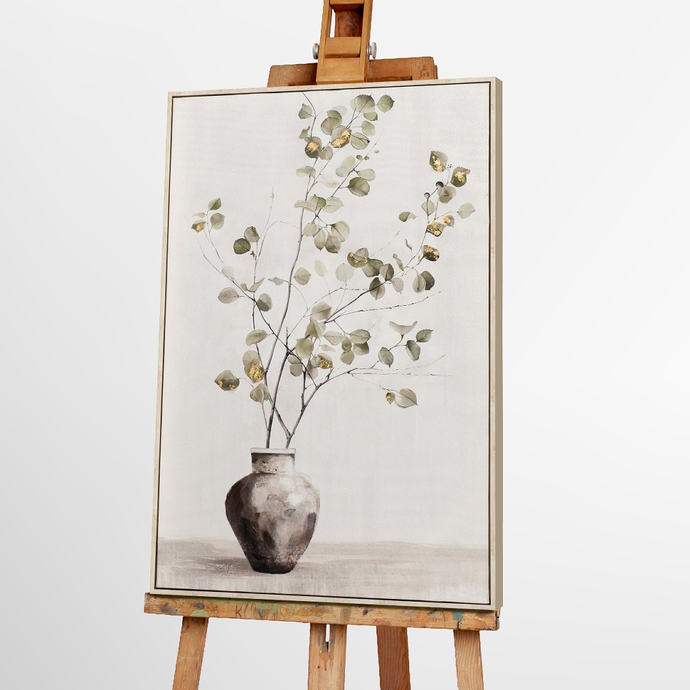 Modern schilderij in abstracte vormgeving. Voorzien van een licht houten lijst. Gemaakt met verschillende technieken in acrylverf op linnendoek. Het linnen zit gespannen op een naaldhouten frame. Op het doek is een vaas met takken afgebeeld. Deze takken zijn gevuld met zacht groen gekleurde bladeren waarvan sommigen afgewerkt zijn met goudfolie. Concluderend is het een kunstzinnig en uniek schilderij. Met de hand gemaakt, sfeervol en buitengewoon decoratief. Een kunstwerk met een geheel eigen sfeer.