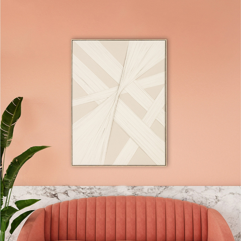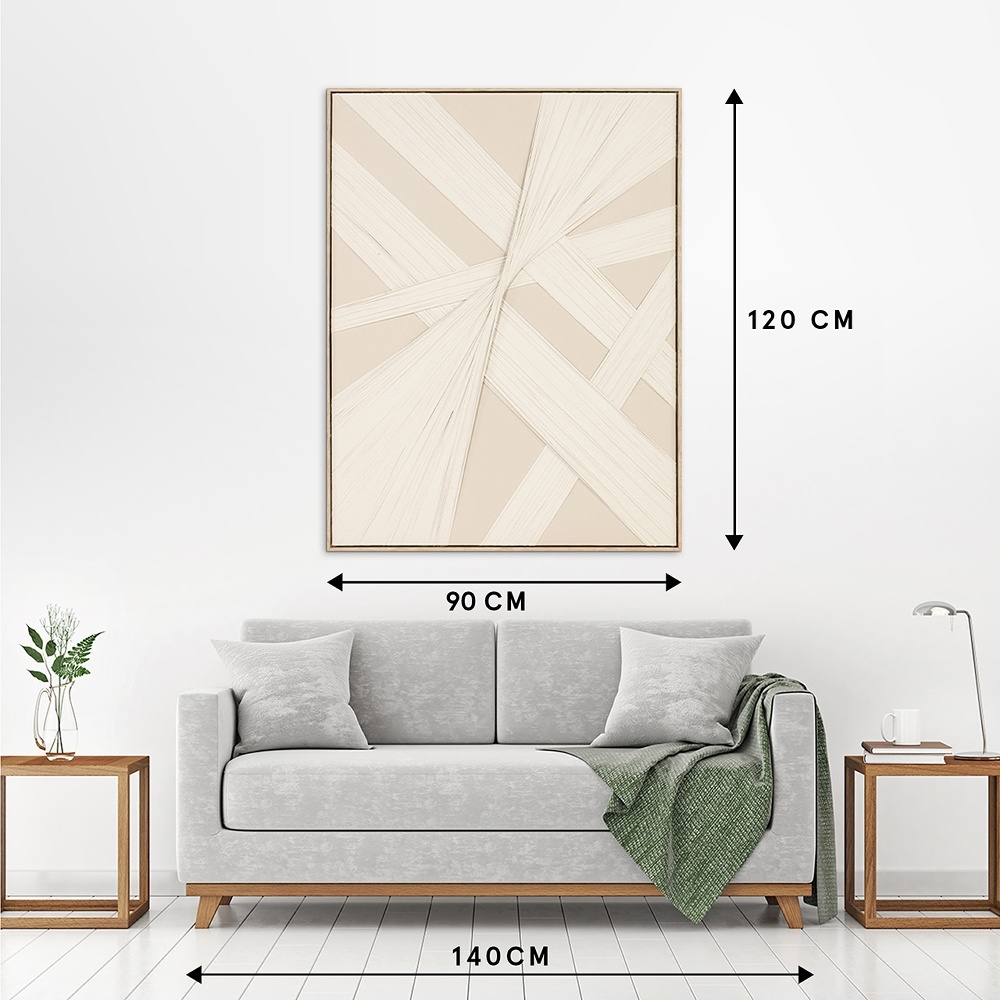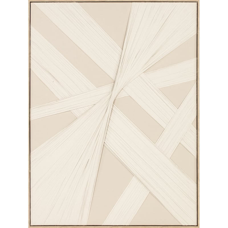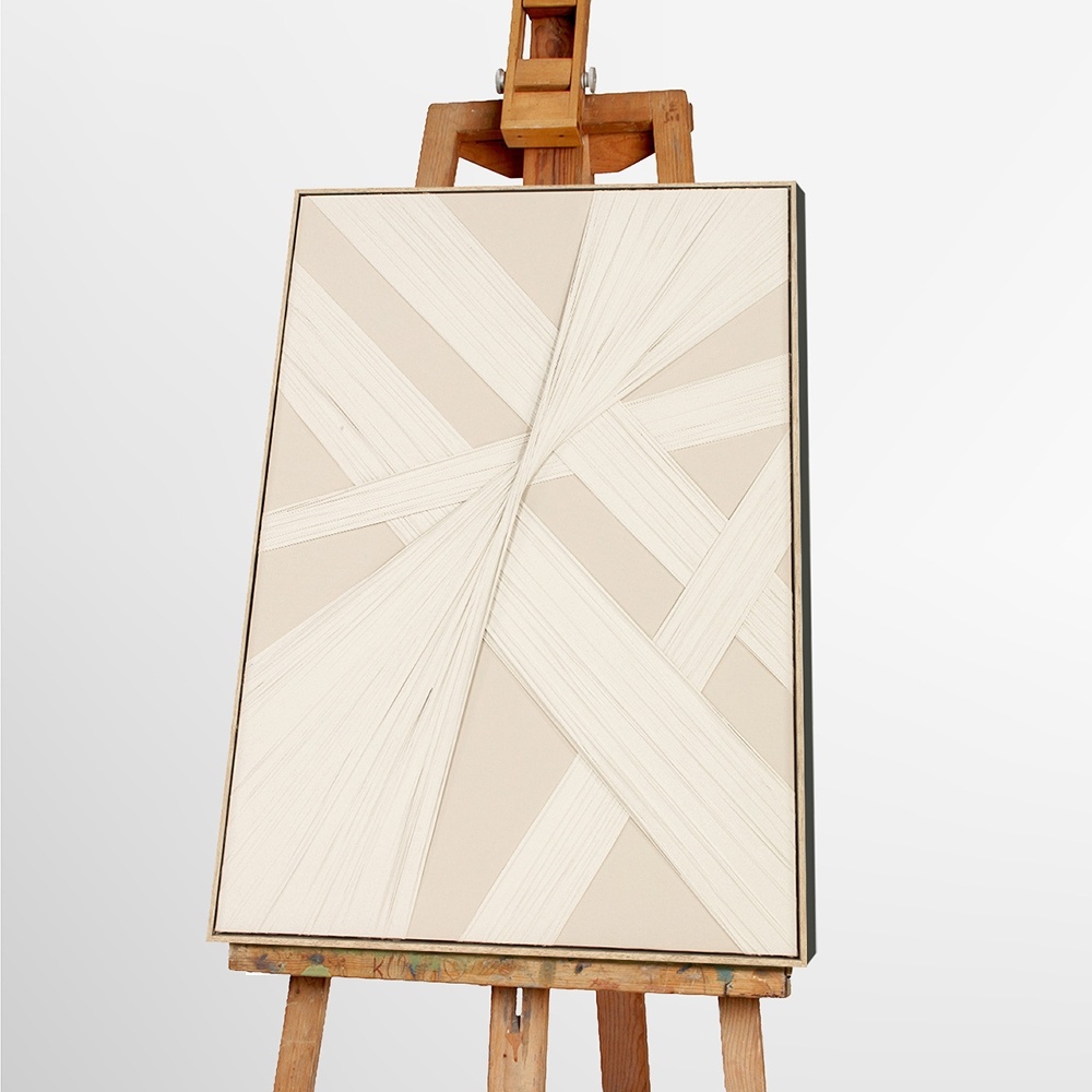 Abstract schilderij in zand en crèmewitte tinten. Met de hand uitgevoerd in acryl op linnendoek met gestrekte stukken textiel hier over heen geplakt. Het geheel zorgt voor een decoratief kunstwerk. Sfeervol en met een eigen stijl. Dit werk past in elk modern interieur.