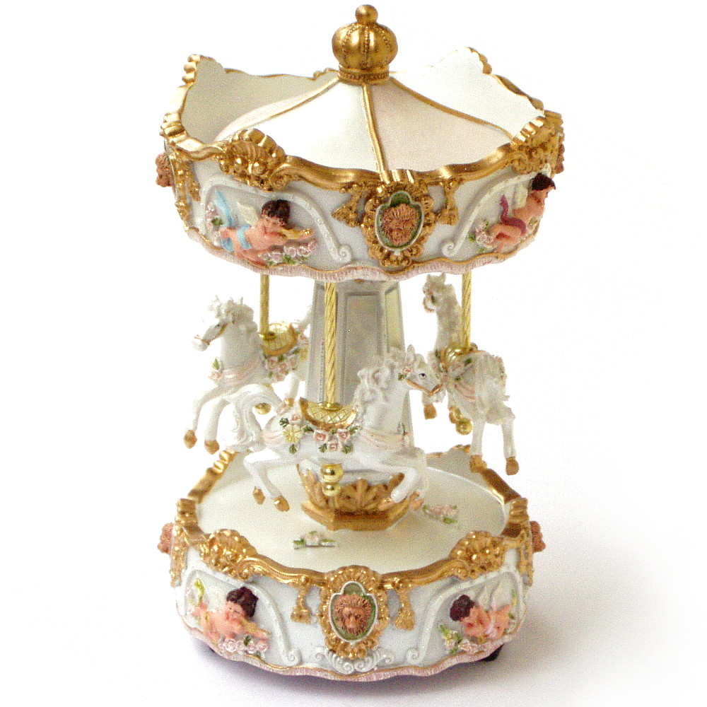 Gemaakt van polyresin, het speelwerk (muziek) is van metaal. Deze carrousel heeft geen vleugelmoer om het mechanisme mee op te winden, dat kan gewoon door de bovenzijde voorzichtig vast te pakken en een paar slagen met de klok mee rond te draaien. Na het opwinden van het mechanisme klinkt de melodie en draait de carrousel rond.