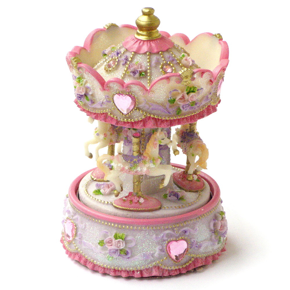 Gemaakt van polyresin, het speelwerk (muziek) is van metaal. Deze carrousel heeft geen vleugelmoer om het mechanisme mee op te winden, dat kan gewoon door de bovenzijde voorzichtig vast te pakken en een paar slagen met de klok mee rond te draaien. Na het opwinden van het mechanisme klinkt de melodie en draait de carrousel rond.