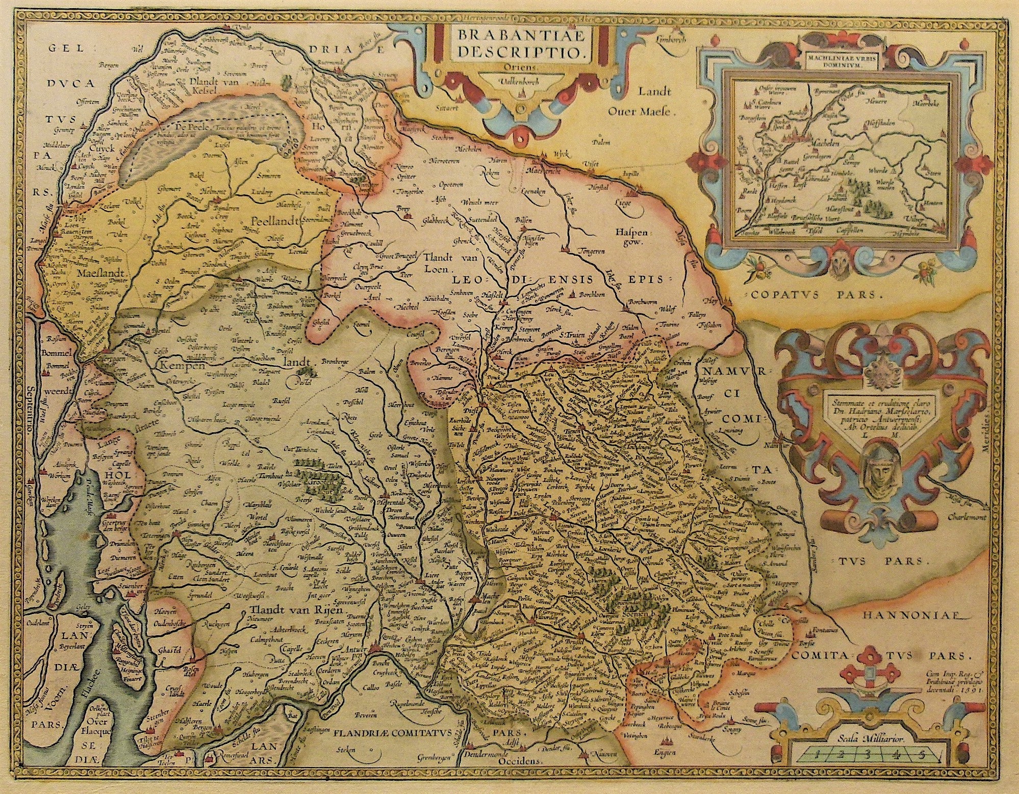Met drie decoratieve cartouches en een inzetkaartje van de streek rond Mechelen.