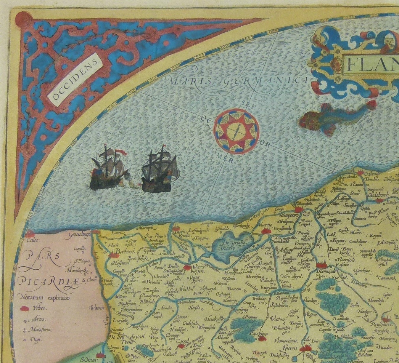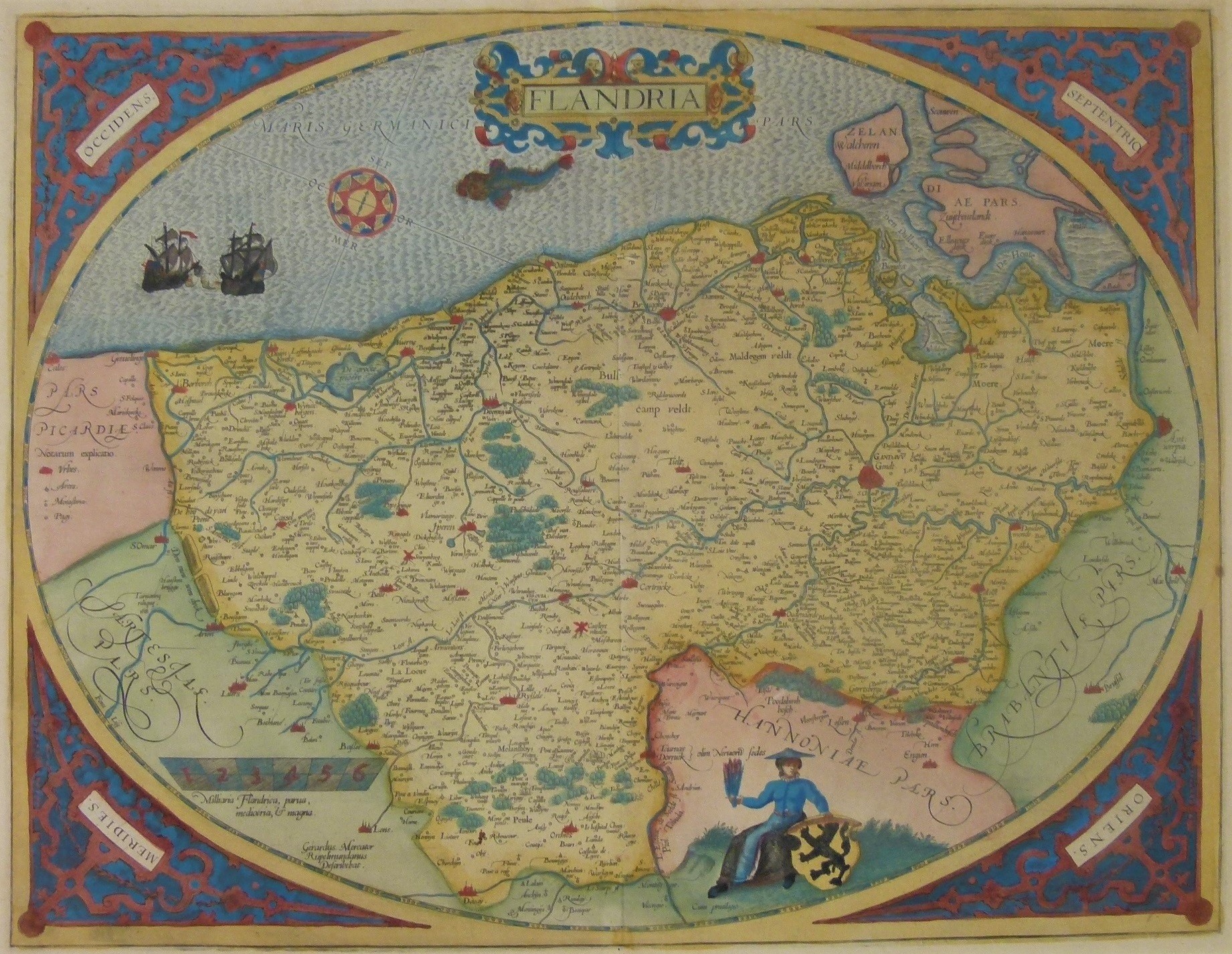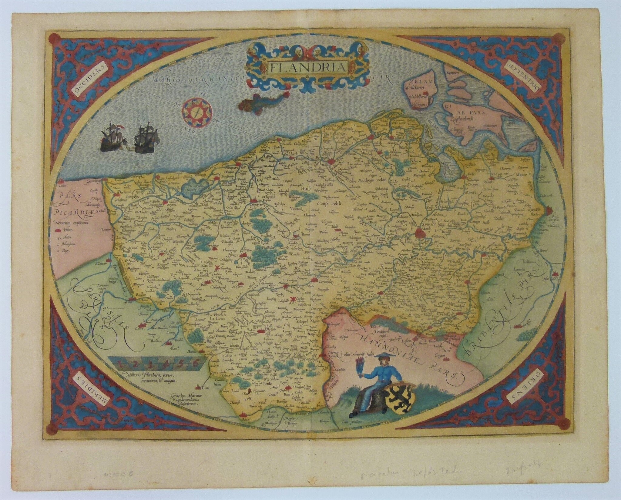 Een prachtig voorbeeld van Ortelius' tweede kaart van Vlaanderen. De kaart is uitgevoerd aan de binnenkant van een decoratieve eivormige rand en is één van de meest decoratieve regionale kaarten van Ortelius. Met decoratieve carthouche, wapenschild, windroos, zeilschepen in strijd en een zeemonster. De kaart is gebaseerd op ‘Vlaenderen. Exactissima Flandriae descriptio', de magnifieke wandkaart door Gerard Mercator uit 1540, een voor die tijd verbazend nauwkeurige kaart.