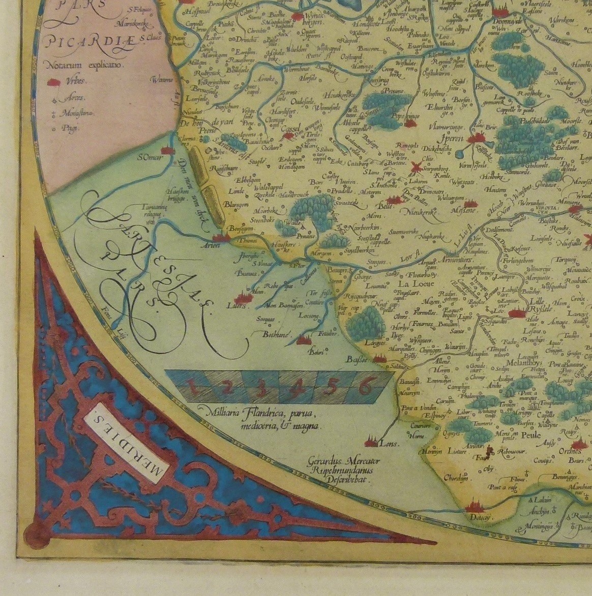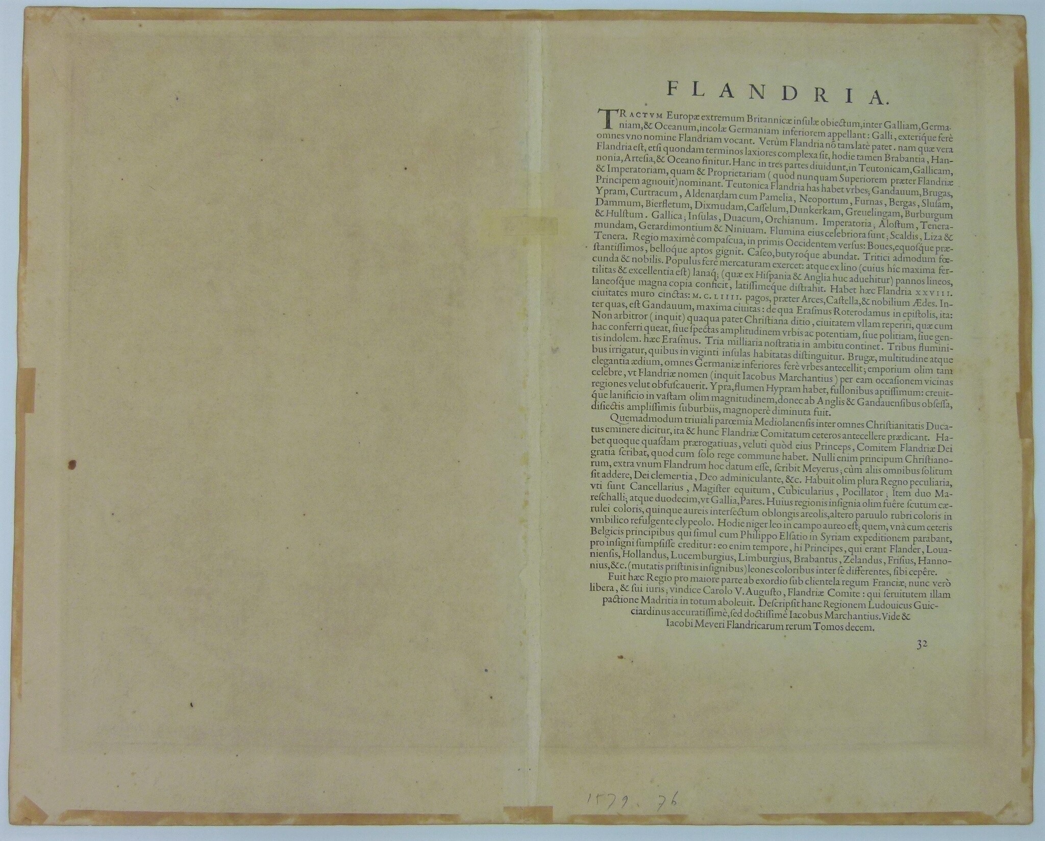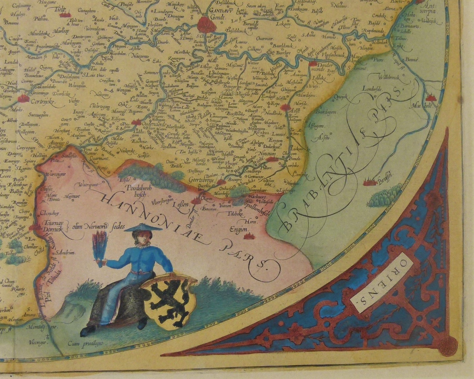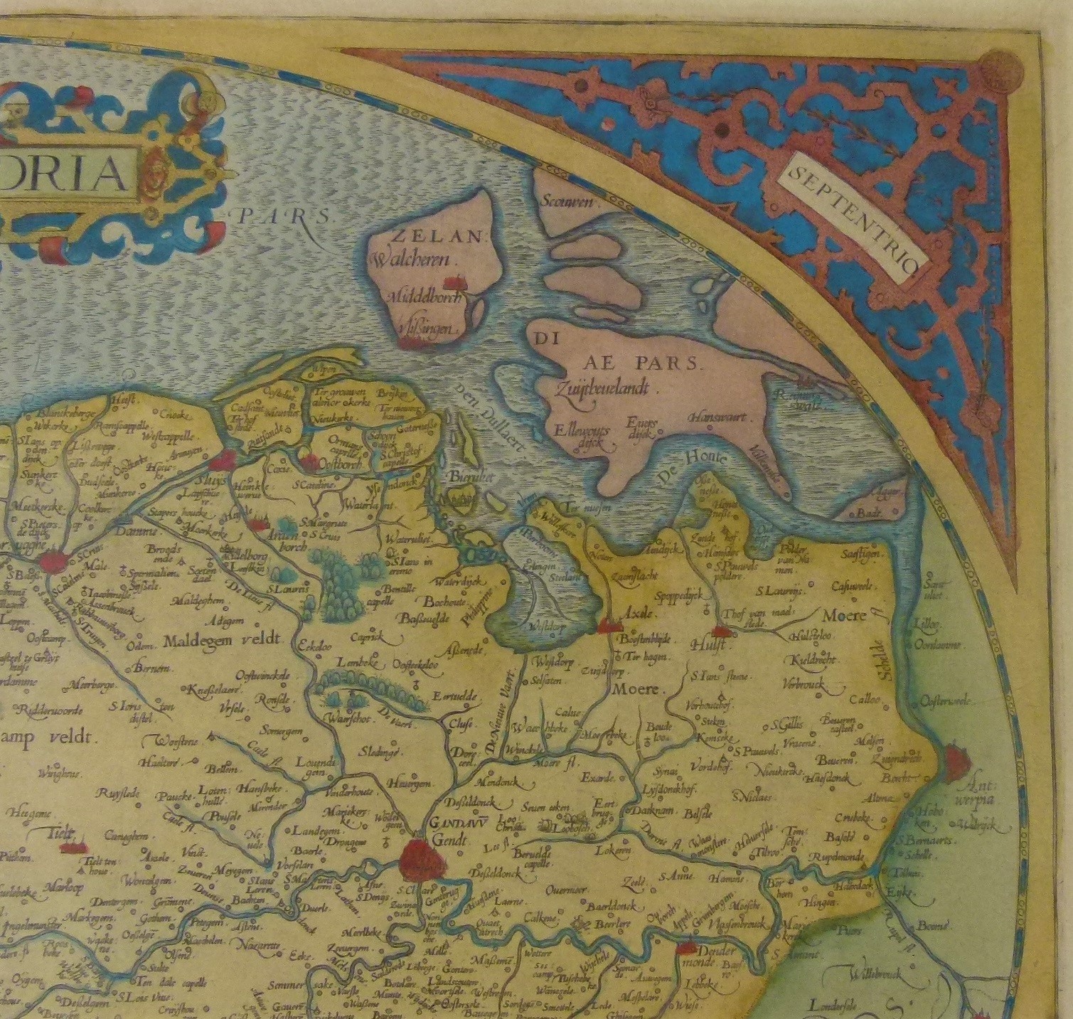 Een prachtig voorbeeld van Ortelius' tweede kaart van Vlaanderen. De kaart is uitgevoerd aan de binnenkant van een decoratieve eivormige rand en is één van de meest decoratieve regionale kaarten van Ortelius. Met decoratieve carthouche, wapenschild, windroos, zeilschepen in strijd en een zeemonster. De kaart is gebaseerd op ‘Vlaenderen. Exactissima Flandriae descriptio', de magnifieke wandkaart door Gerard Mercator uit 1540, een voor die tijd verbazend nauwkeurige kaart.