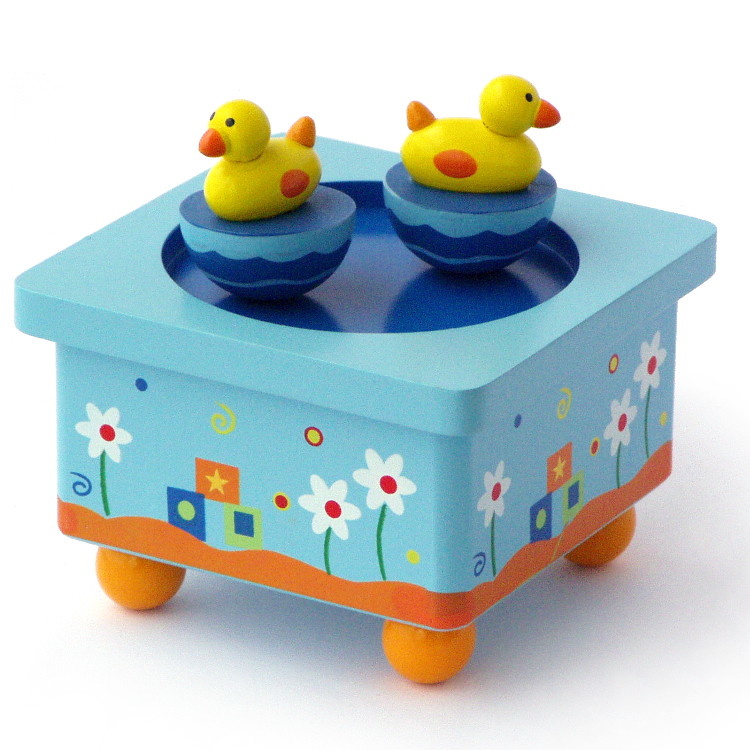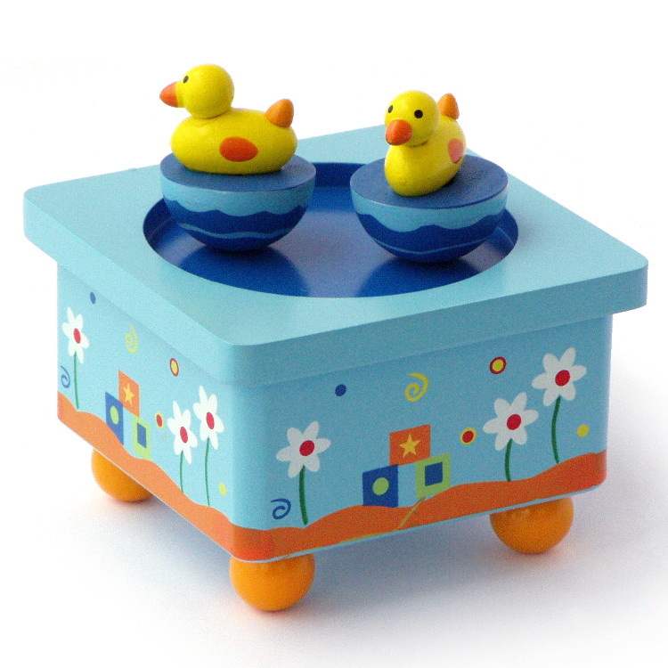 Houten speeldoos met vrolijk dansende eendjes. Beide zwemmen in het kleine ronde vijvertje met het donkerblauwe water. Op de kant staan kleine witte bloemetjes. Na het opwinden van het mechanisme, met de vleugelmoer aan de onderzijde, draaien de twee eendjes elk snel om hun as terwijl ze gelijktijdig samen ronddraaien op het plateau (twee bewegingen)! Tijdens het draaien klinkt de melodie.