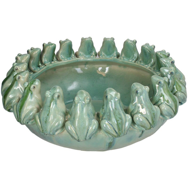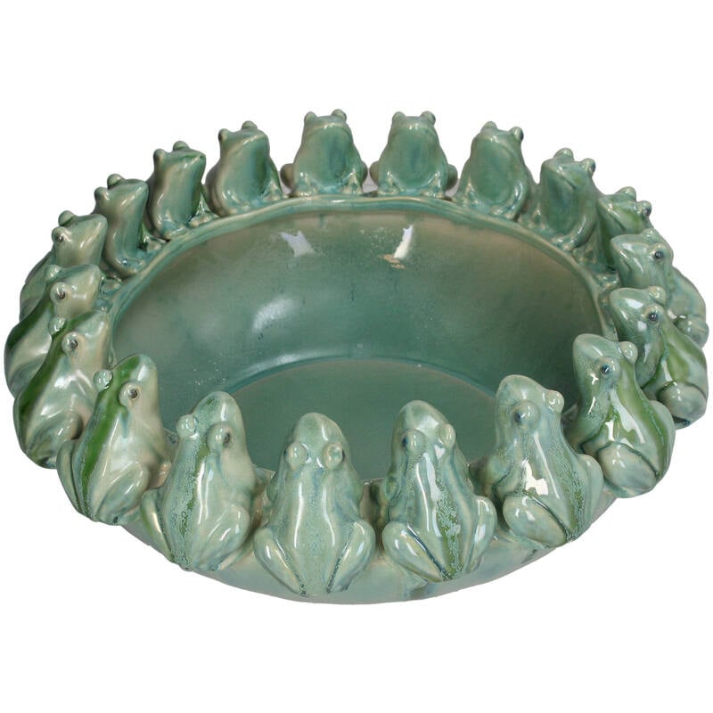 Zeker een mooie aandachttrekker voor op de eettafel of een mooi dressoir. Deze geglazuurde keramieken schaal is gedecoreerd met de leukste kikkertjes zittend op de rand. Met haar mooie groene kleur staat het erg mooi in een strak en licht interieur maar ook in een kleurrijk interieur springt deze schaal eruit!