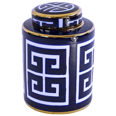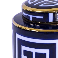 Deze vaas met deksel, of opberg pot, van porselein heeft een oogstrelende uitstraling. En met zijn mooie donkerblauwe ondergrond afgewerkt met gouden randen en witte details is dit een pronkstuk. Mooi op een dressoir, in een kast of op de vensterbank.