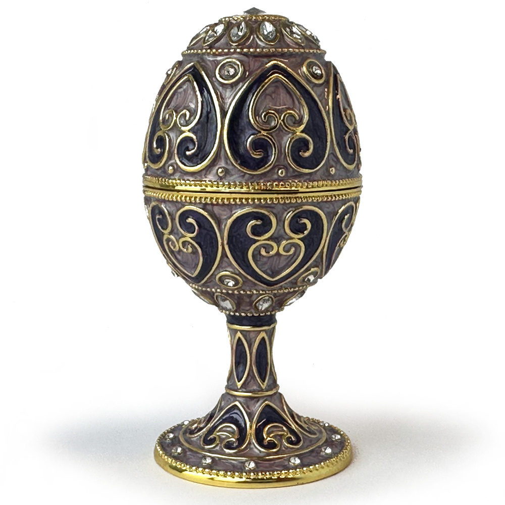Decoratief muziekdoosje in de stijl van een Fabergé-ei. Uitgevoerd in lila met paars geëmailleerd metaal en gedecoreerd in een Oosters patroon met druppel- of bladmotieven in goud. Het ei is tevens ingelegd met kleine Swarovski® steentjes. Bovenop ligt een groot sierkristal.