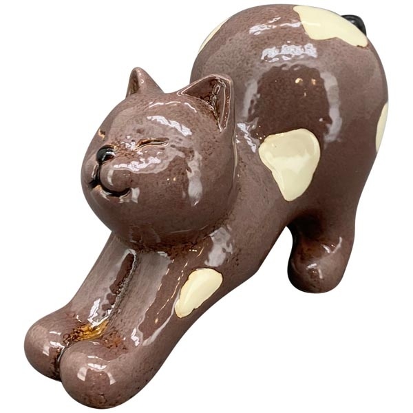 Deze nog luie kat rekt zich uit omdat hij zojuist uit een diepe slaap is gekomen. Zoals katten dat zo heerlijk gracieus kunnen doen. Deze kat is gemaakt van keramiek en afgewerkt in bruin met witte vlekken en een zwarte staart. Met zijn kont omhoog en poten naar voren gestrekt is deze kat een toevoeging in je interieur. Zeker voor kattenliefhebbers en als je gek bent op leuke eyecatchers. Hij zal de show stelen in jouw huis!