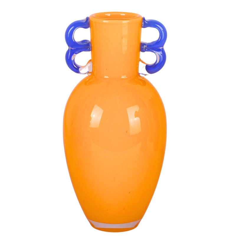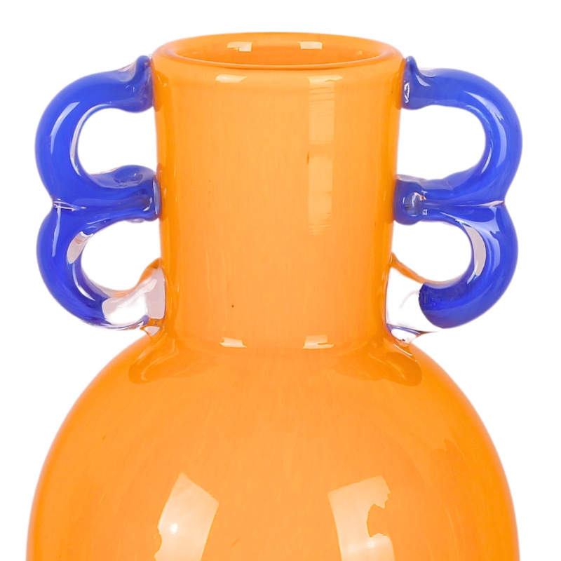 Decoratieve oranje glazen vaas met donker blauwe oortjes. Door zijn strakke vorm past de vaas goed in een strak maar ook zeker in een kleurrijk interieur. Opvallend mooi ook zonder een boeket!