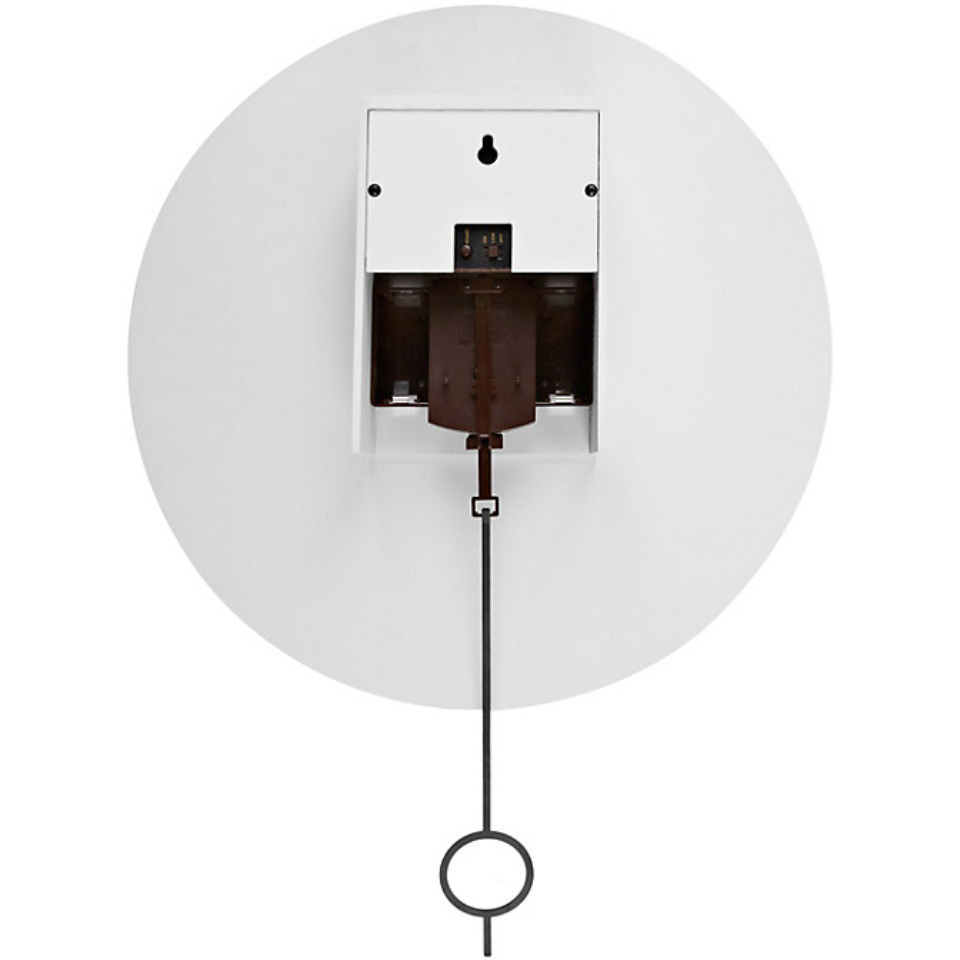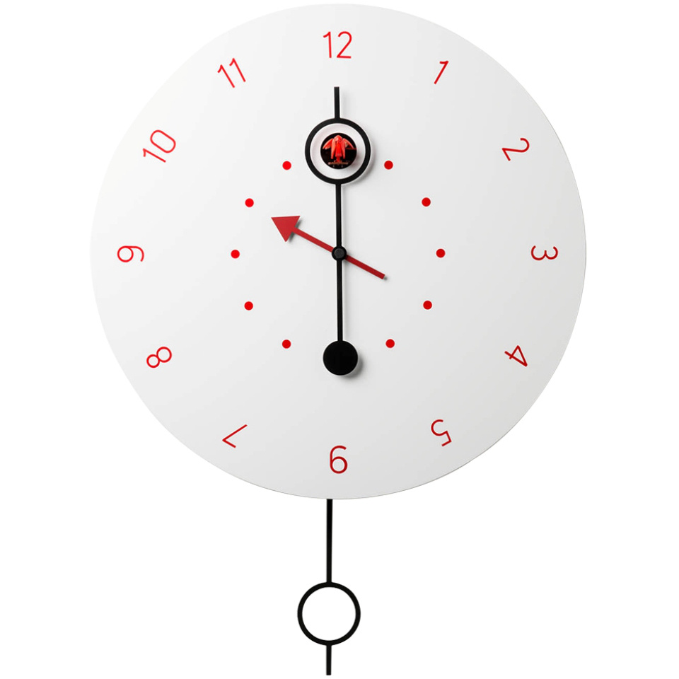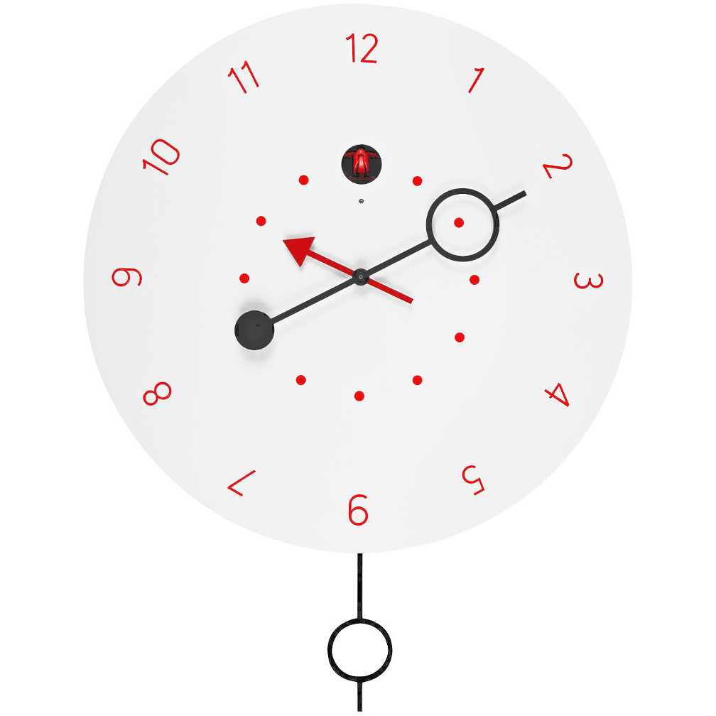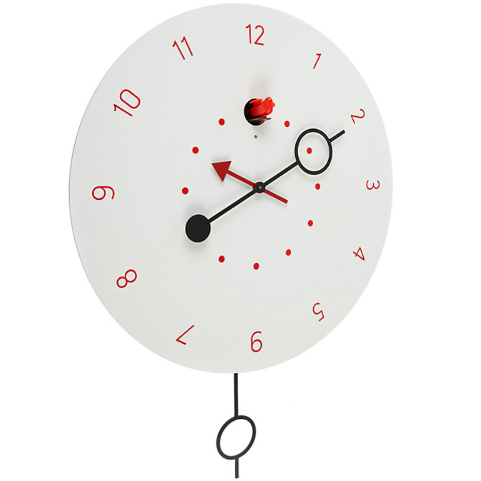 Ronde design koekoeksklok met cijfers van Italiaanse origine. Als de grote wijzer op 12 staat komt de koekoek door de ronding in de grote wijzer naar buiten en laat zich vervolgens zo vaak horen als dat de klok aanwijst. Hierbij buigt het vogeltje telkens iets voorover en slaat het tegelijkertijd zijn vleugels uit. Het geluid van de koekoek doet ruimtelijk aan. Het klinkt alsof je in een groot bos staat, inclusief de echo van de koekoek. De klok is voorzien van een quartz-uurwerk met een elektronische koekoek. Een lichtsensor zorgt er automatisch voor dat de klok op de dag- of nachtstand gaat. Hierdoor geeft hij als het donker is geen geluid. Het volume van de klok en de werking van de koekoek kan men naar eigen inzicht instellen. De klok is ontworpen door Marco Marzini.