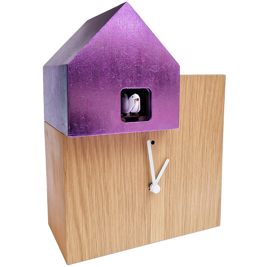 Moderne koekoeksklok in Italiaans design. Bij deze strakke wandklok van het merk Domeniconi ondersteunt het onderste eiken vierkant een uitspringend vogelhuisje dat met violet folie beplakt is, naar het Italiaanse woord Ettore (ondersteunen). Als de grote wijzer op 12 staat komt de koekoek naar buiten en laat zich vervolgens zo vaak horen als dat de klok aanwijst. Hierbij buigt het vogeltje telkens iets voorover en slaat het tegelijkertijd zijn vleugels uit. Het geluid van de koekoek doet ruimtelijk aan. Het klinkt alsof je in een groot bos staat, inclusief de echo van de koekoek.