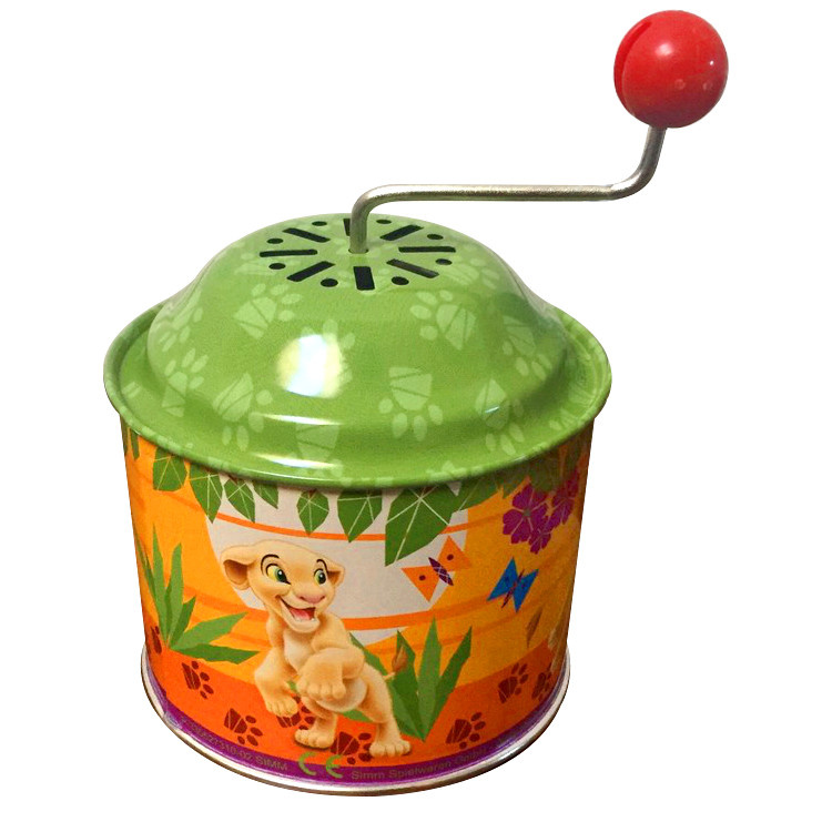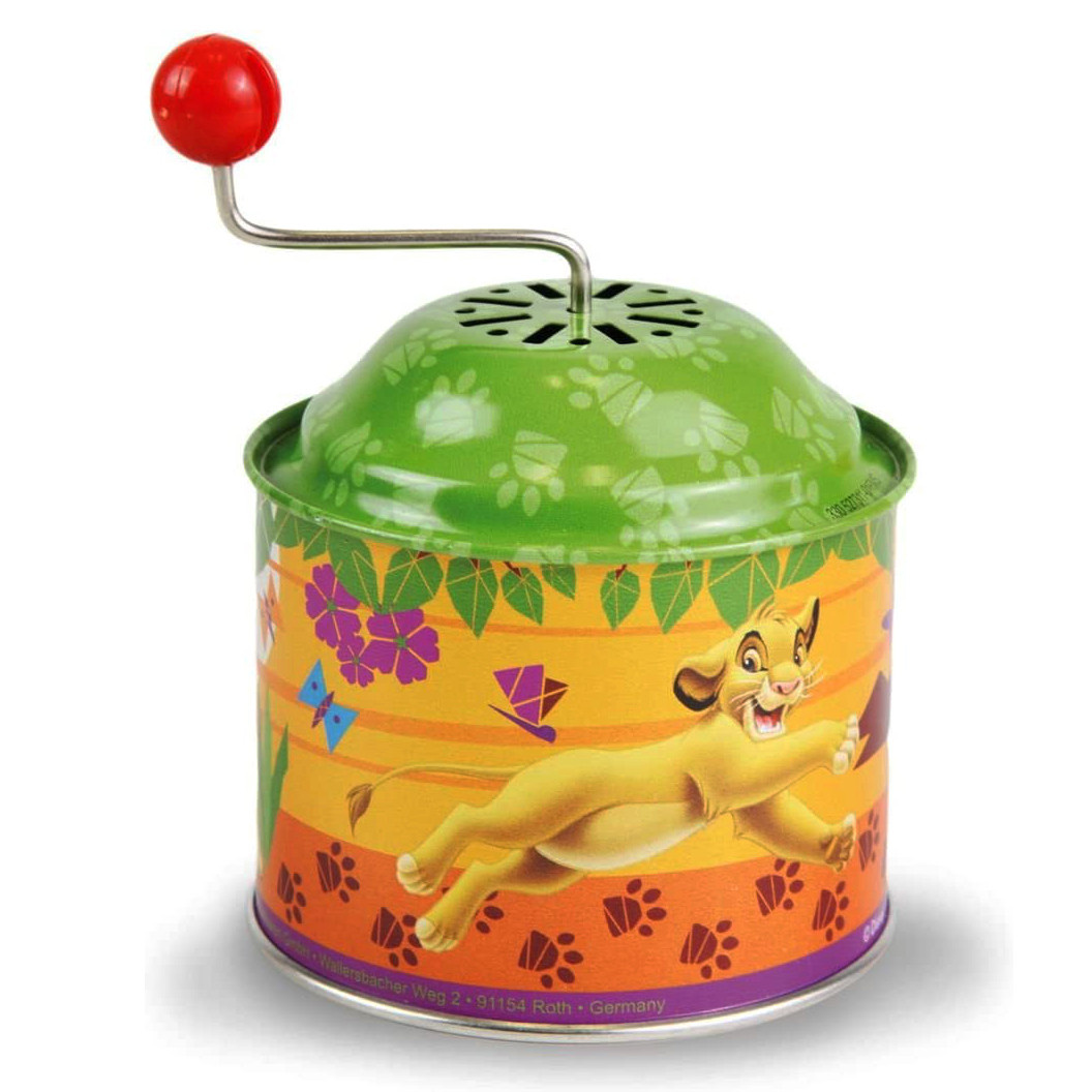 Draaidoos gemaakt van blik met massief metalen onderdelen. Alleen de slinger is voorzien van een rood, kunststof bolletje. De draaidoos is gedecoreerd in de sfeer van The Lion King. De beroemde Amerikaanse tekenfilm en musical van Walt Disney. Zo is een spelende Simba te zien samen met zijn vriendjes; het Wrattenzwijn Pumbaa en de meerkat Timon. Ook staan er rondom pootafdrukjes van Simba op.