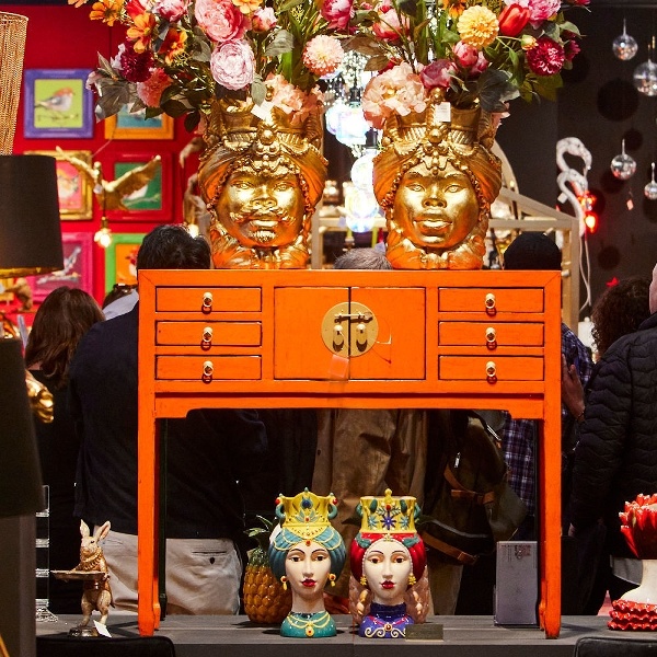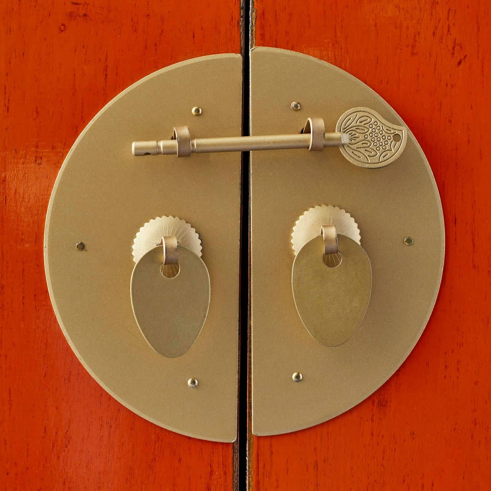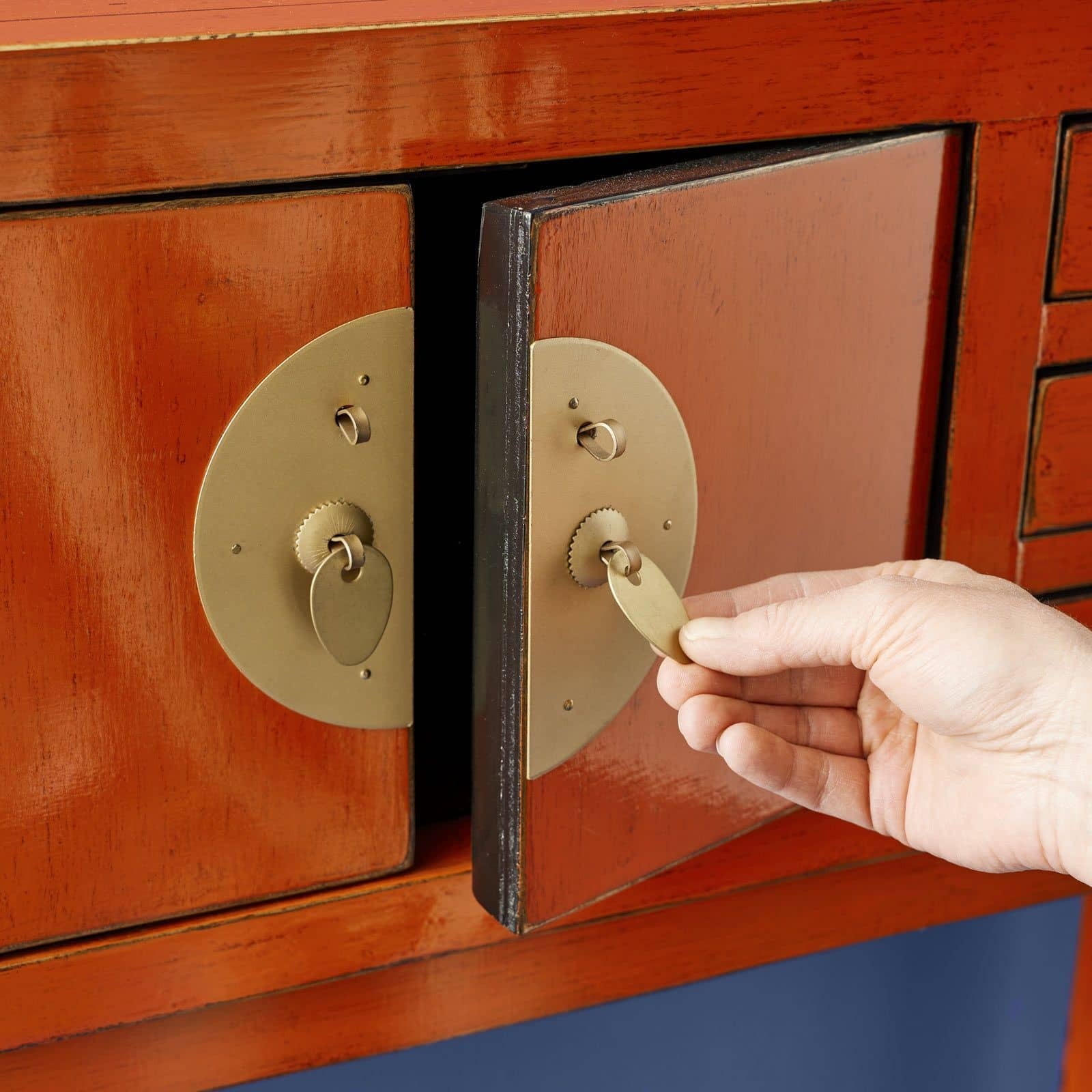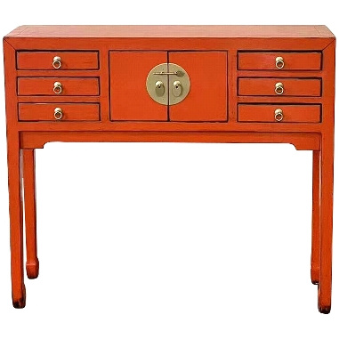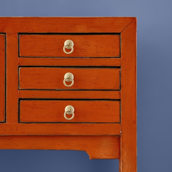 Prachtig houten vintage kastje uitgevoerd in oranje kleur met goudkleurig beslag. Het kastje biedt opbergruimte en 6 kleine laden en staat uitstekend in een hal of woonkamer, decoratief en in het oog springend!