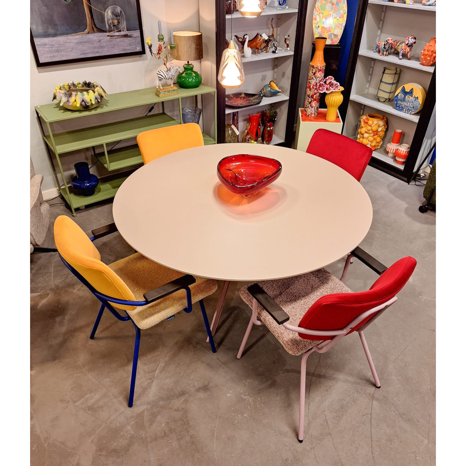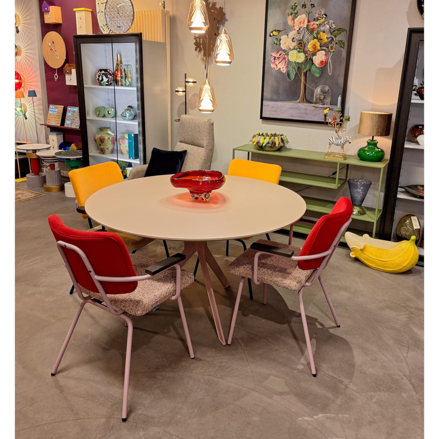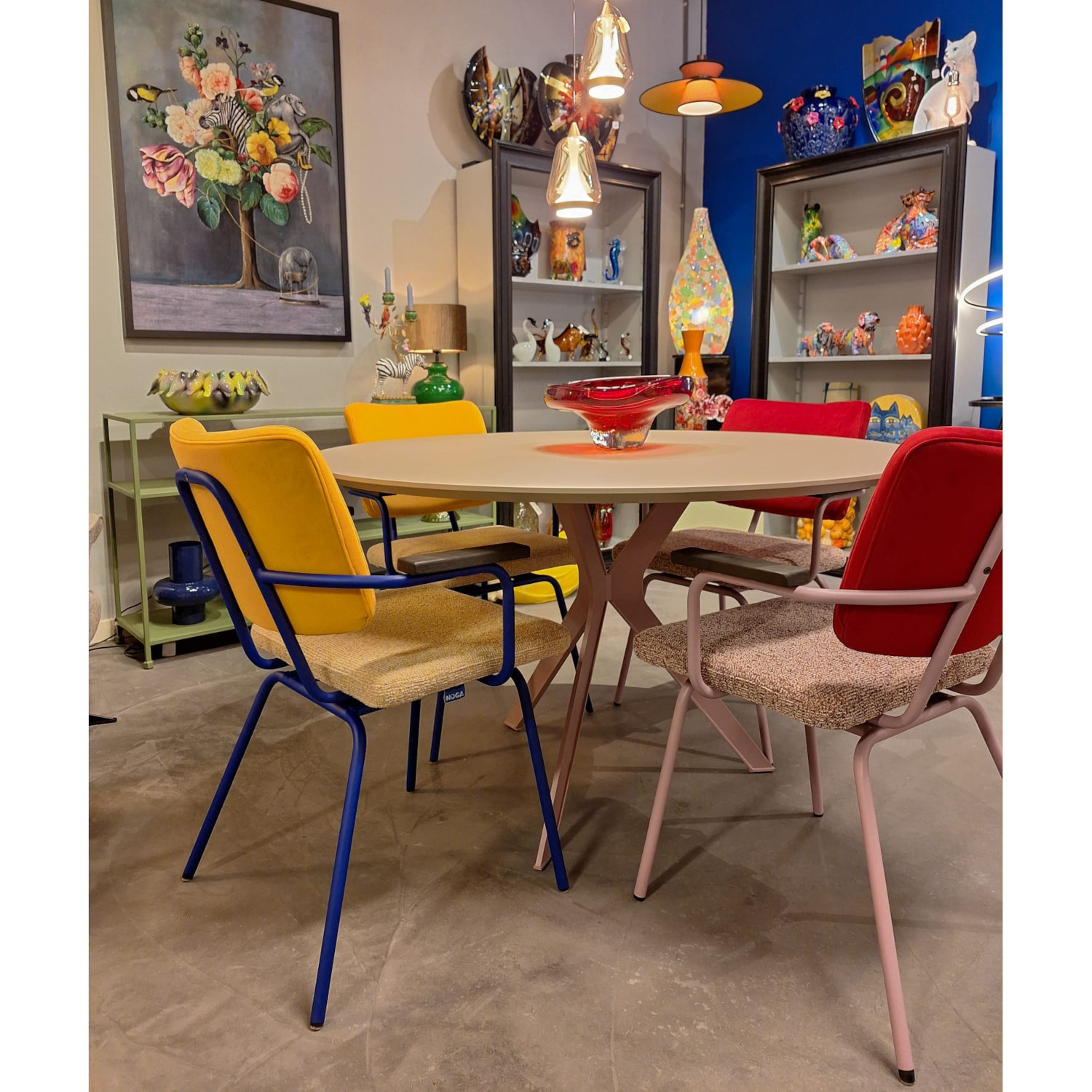De poot heeft de kleur opties: cloud, taupe, zwart en violet. Het blad heeft de kleur opties: taupe, roze en satin. De eetkamertafel zoals getoond in onze winkel hebben wij zelf samengesteld, zie laatste foto's. Het showmodel heeft een taupe blad met een violet poot. Bekijk de stalen bij ons in de winkel!