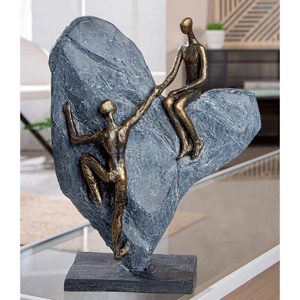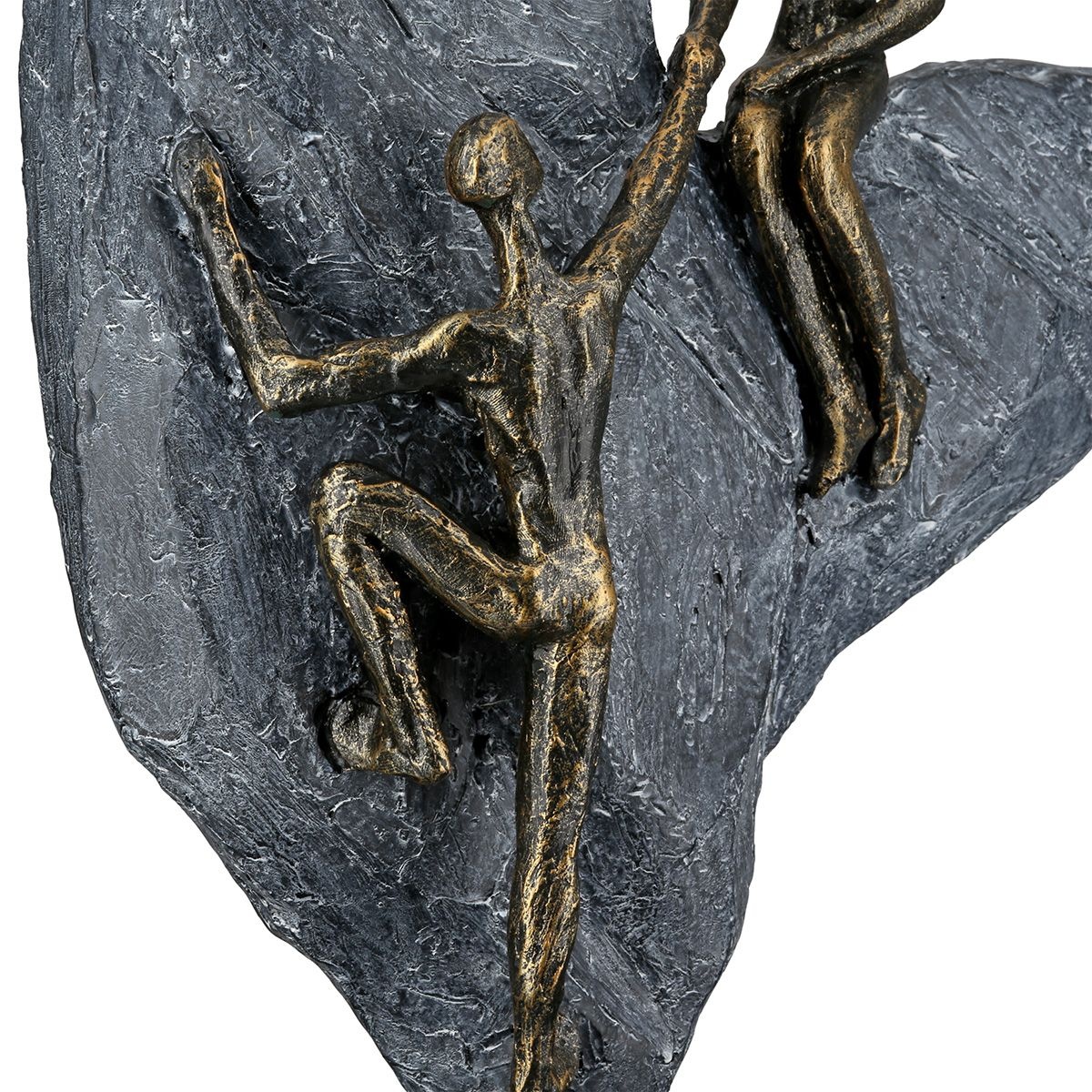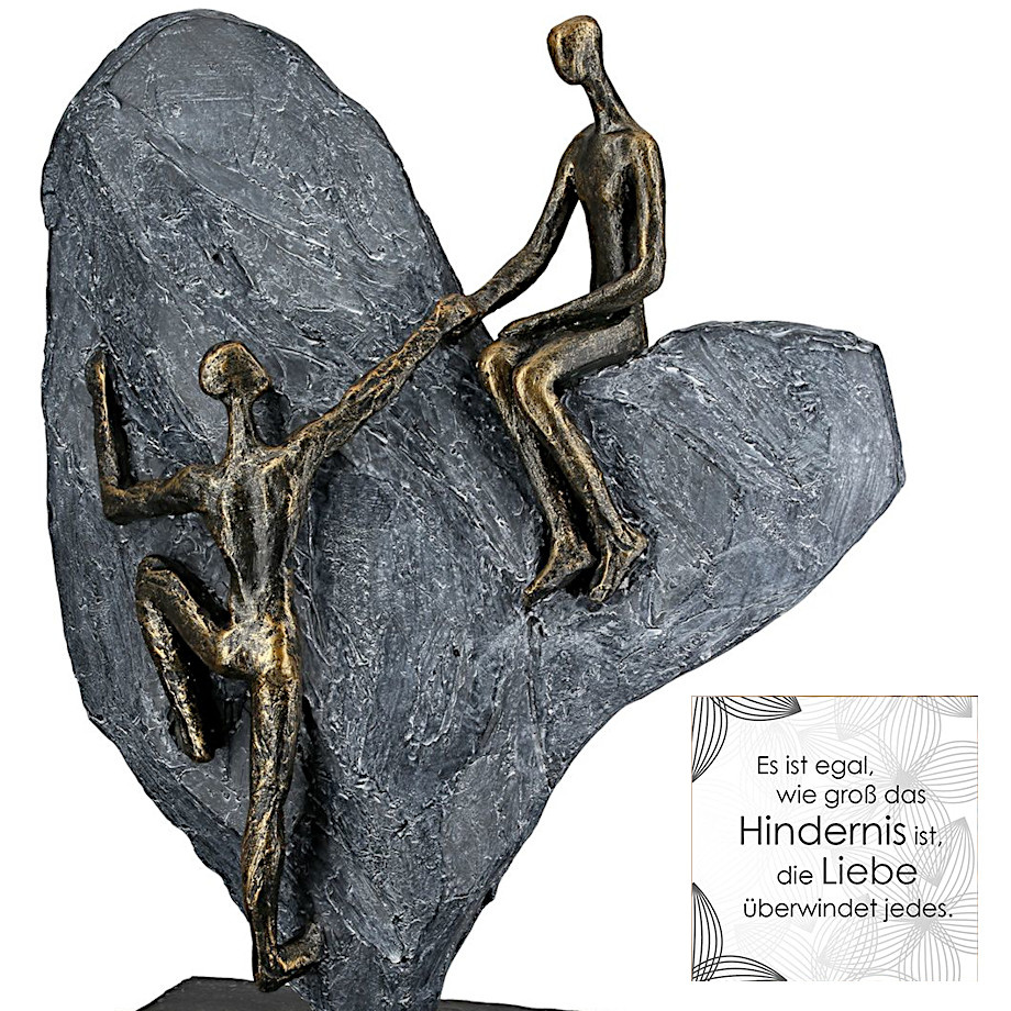 Modern vormgegeven beeld met robuuste uitstraling. Te zien is een groot stenen hart waar een (nog steeds) verliefd paar samen tegenop klimt. De vrouw heeft de top al bereikt en helpt nu de man omhoog. Dit beeld staat symbool voor de kracht van de liefde. Creatief uitgebeeld in polyresin (hoogwaardige kunsthars) en uitgevoerd in antraciet, mat zwart en antiek brons.