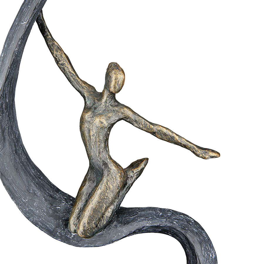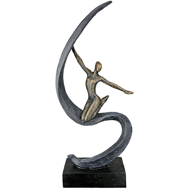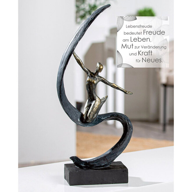 Modern beeld van een vrouw die vrij beweegt met een sierlijk golvend lint. Dit sculptuur staat symbool voor de levensvreugde van een vrouw. Zoals is omschreven op het bijgevoegde Duitse tekstkaartje: 'Joie de Vivre betekent levensvreugde, moed om te veranderen en kracht voor nieuwe dingen'.