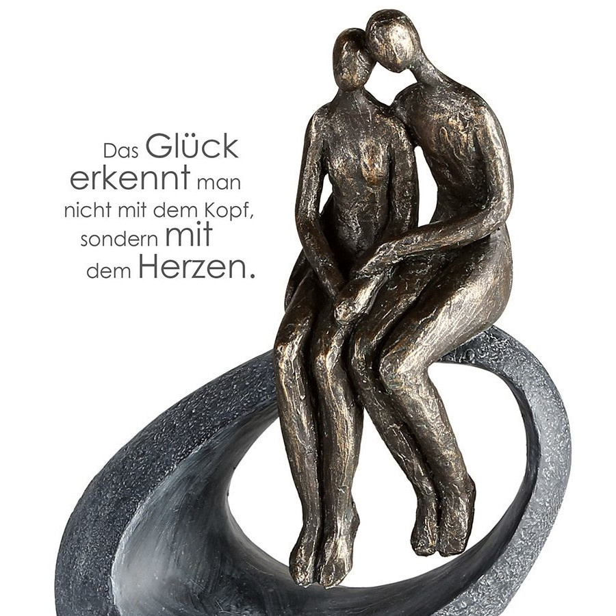 Modern sculptuur met een man en een vrouw zittend op een organisch gevormd figuur. Het stel zit liefdevol naast elkaar waarbij de man de vrouw teder vasthoud en met zijn hoofd zachtjes tegen dat van haar leunt. Uit de serie "Karaktereigenschappen" van de Duitse firma Gilde. Dit beeld staat natuurlijk symbool voor het geluk en de band die liefde tussen twee mensen smeed. Het Duitse tekstkaartje luidt dan ook dichterlijk: 'Geluk ervaar je niet met je hoofd, maar met je hart'.