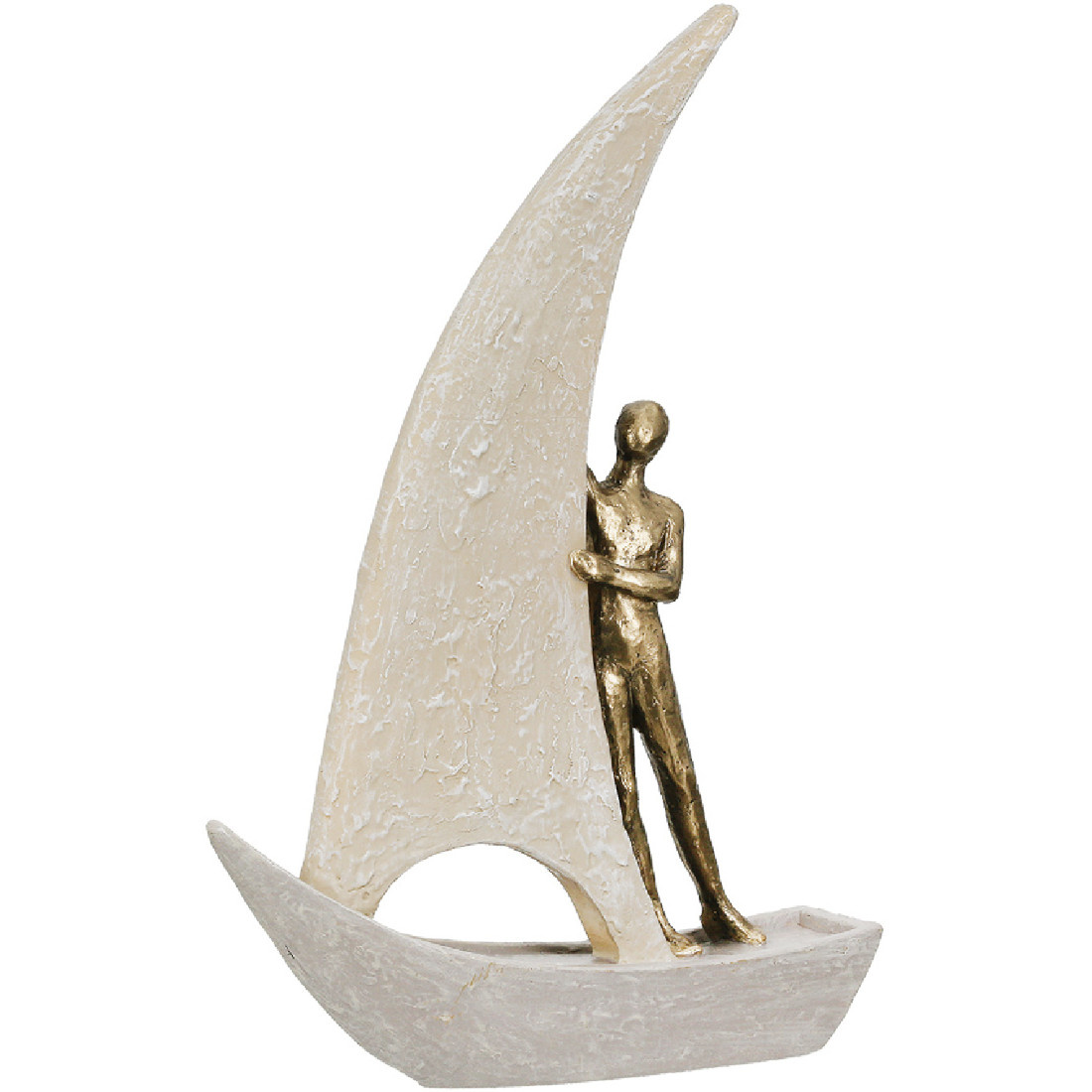 Stijlvol 'bewegingsbeeld' van een man op zijn zeilboot. Voor iedere boot of water fanaat is dit beeld een geweldige toevoeging in het interieur. Door zijn lichte kleuren in combinatie met goud past het beeld ook bij veel verschillende interieur stijlen. Rustig, kleurrijk of modern, het past allemaal.