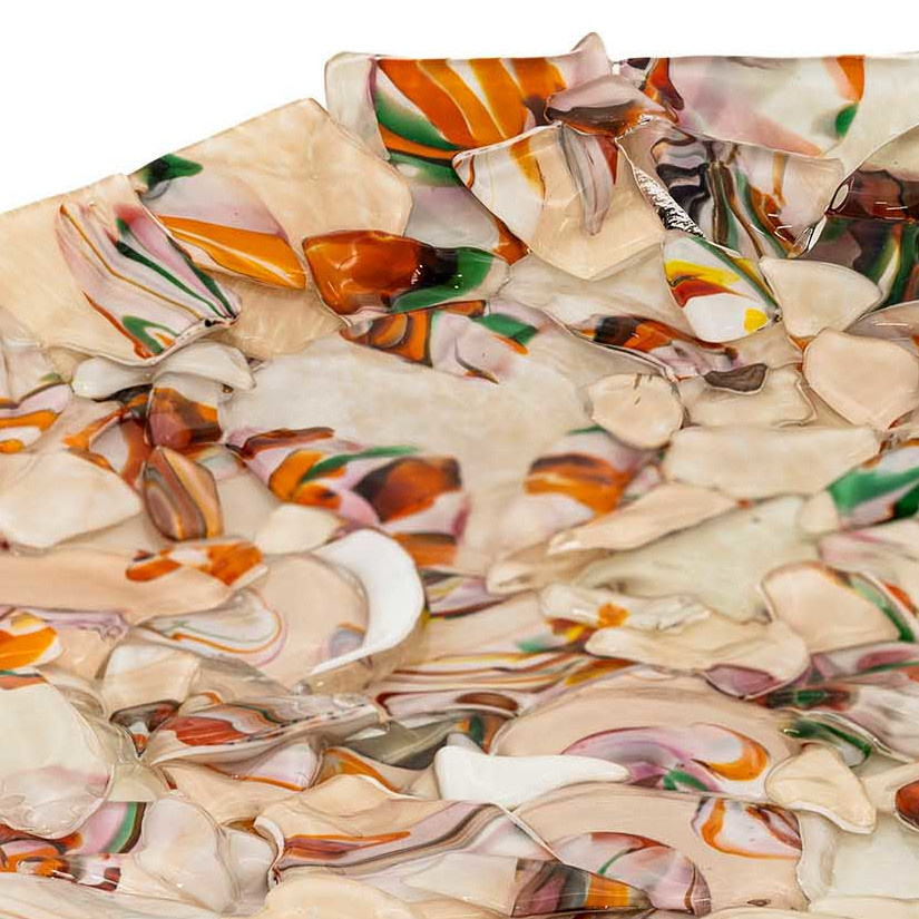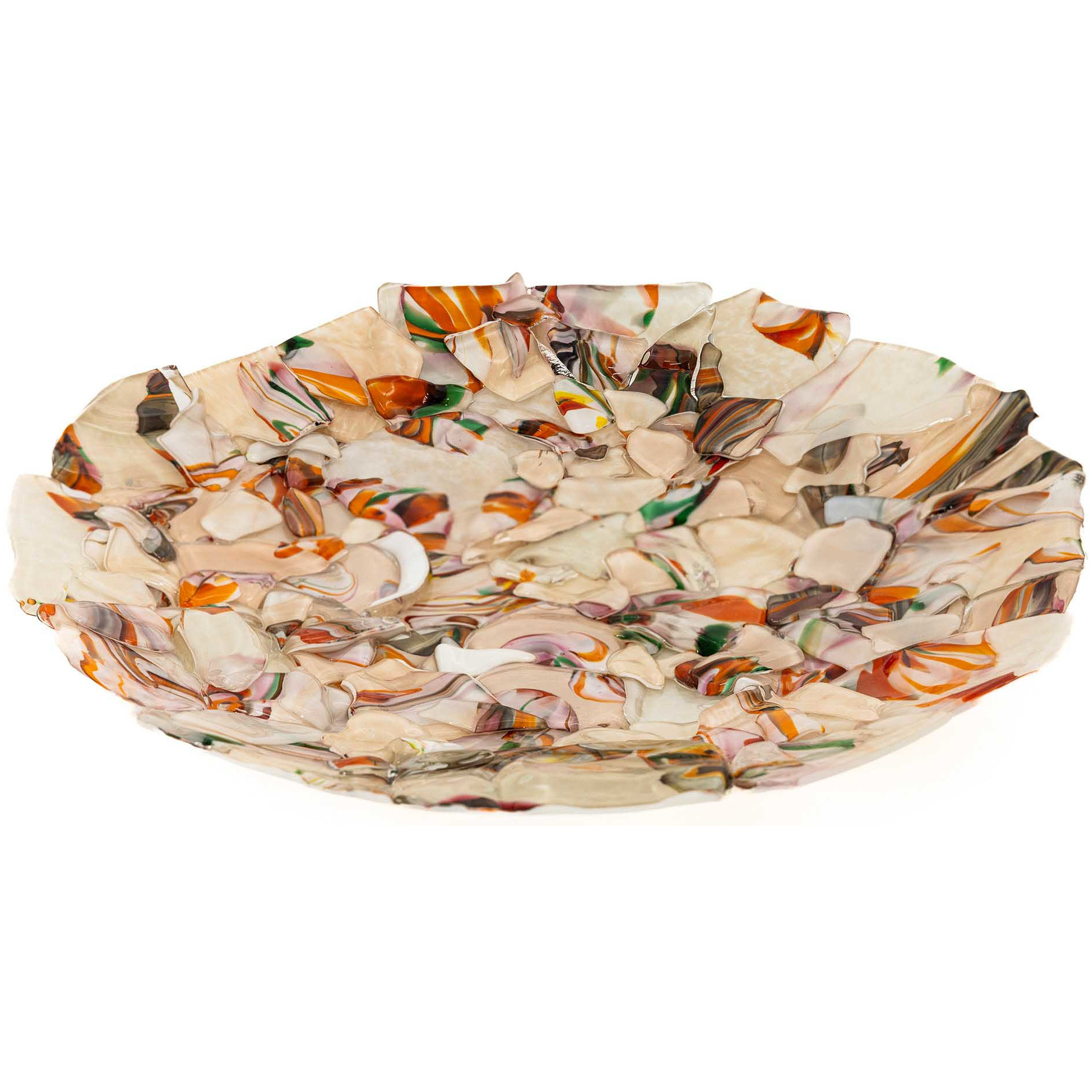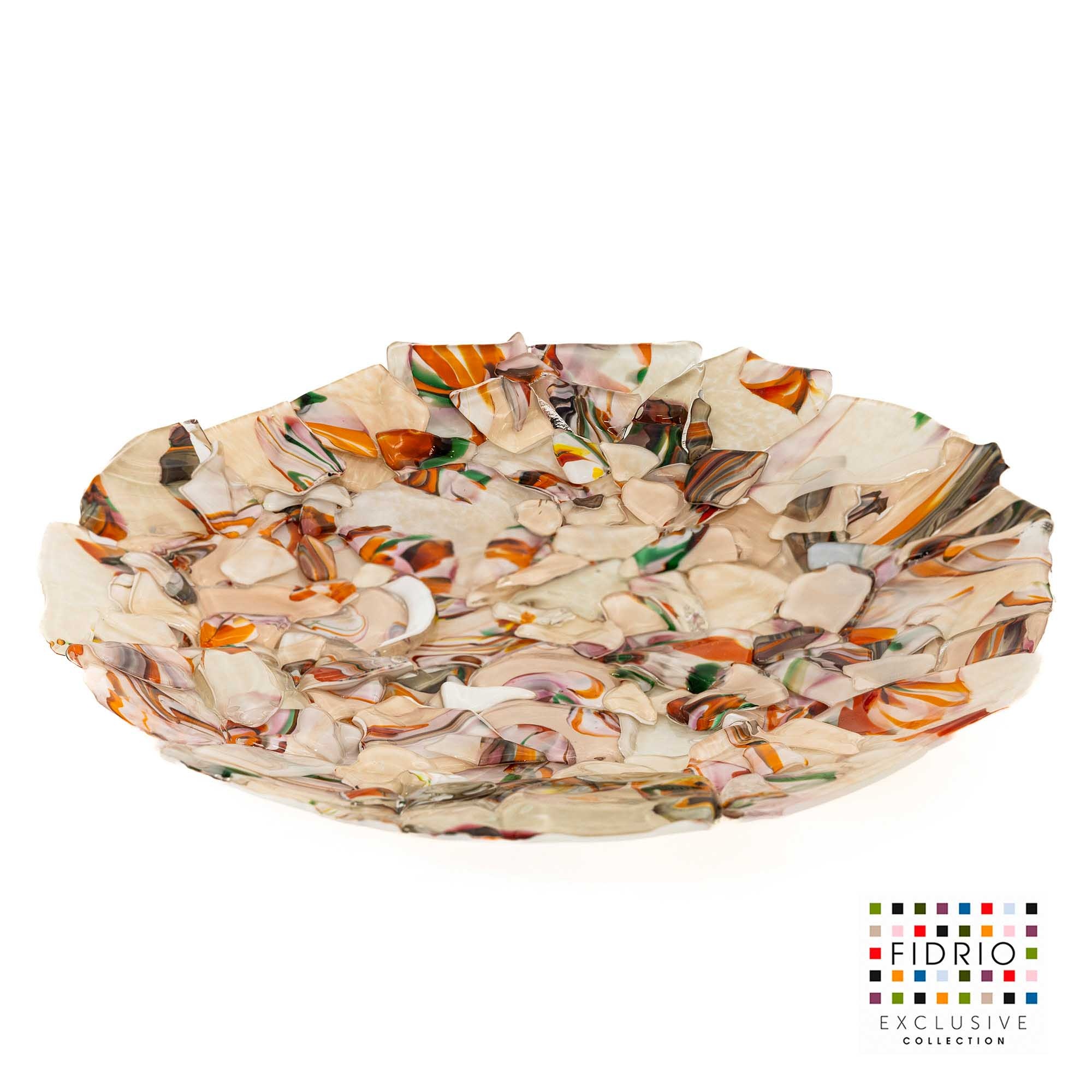 Decoratieve glazen schaal uit de Fidrio exclusive collection. Met een luxe uitstraling opgebouwd uit diverse stukken glas door middel van de zogenaamde fusion techniek. Uitgevoerd in de matchende kleuren oranje/rood/roze/groen.