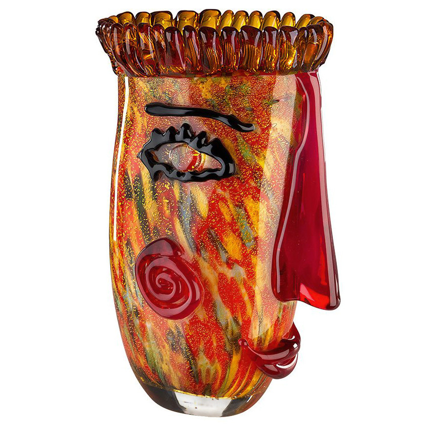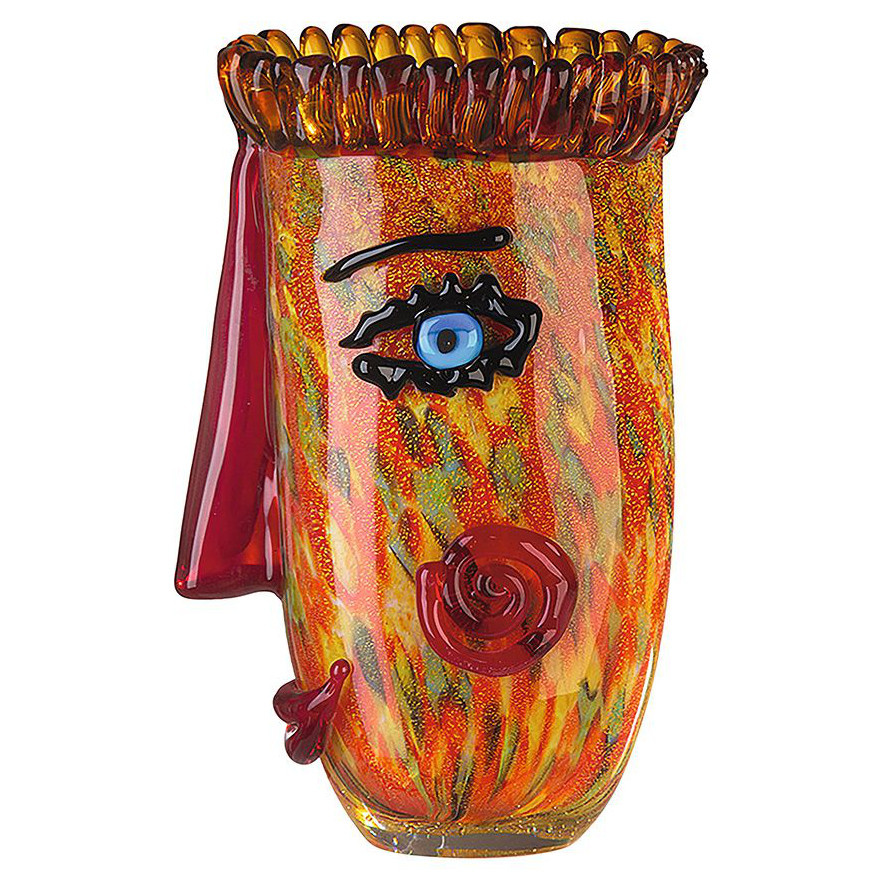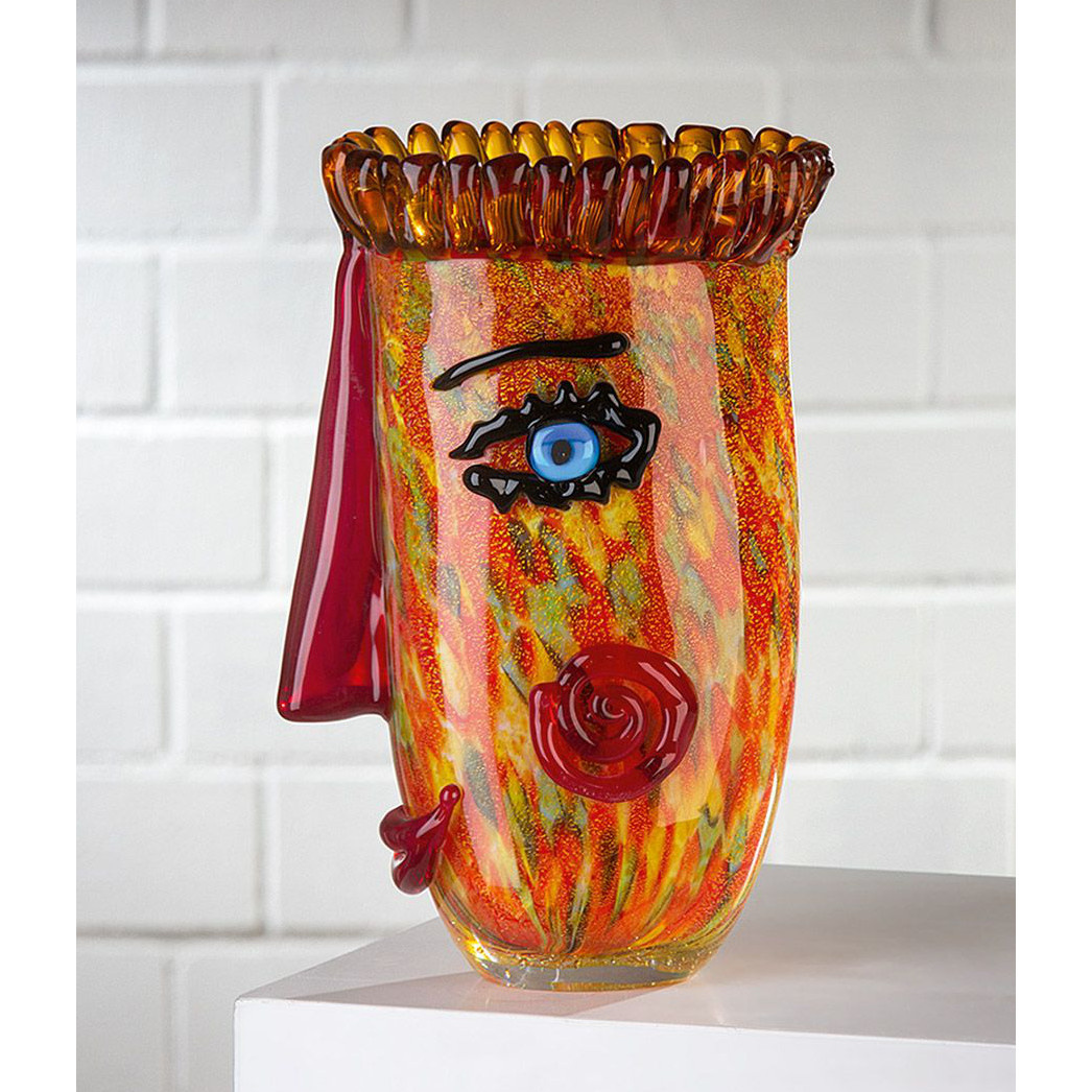 Mond geblazen design vaas uit de Glass-Art serie van het Duitse merk Gilde. De vaas is gemaakt volgens het yin en yang principe. Het gemodelleerde gezicht heeft aan één zijde een oog open, aan de andere een oog dicht. Deze ambachtelijke vaas wordt gekenmerkt door zijn warme kleuren, wat nog eens onderstreept wordt door de 'blosjes' op zijn wangen. Verder zou je kunnen zeggen dat dit een stekelkoppie is. Maar door een andere bril bekeken kun je daar ook maar zo een kroon van maken en krijgt deze vaas ineens koninklijke uitstraling! Enfin, u mag bepalen wat beter past...