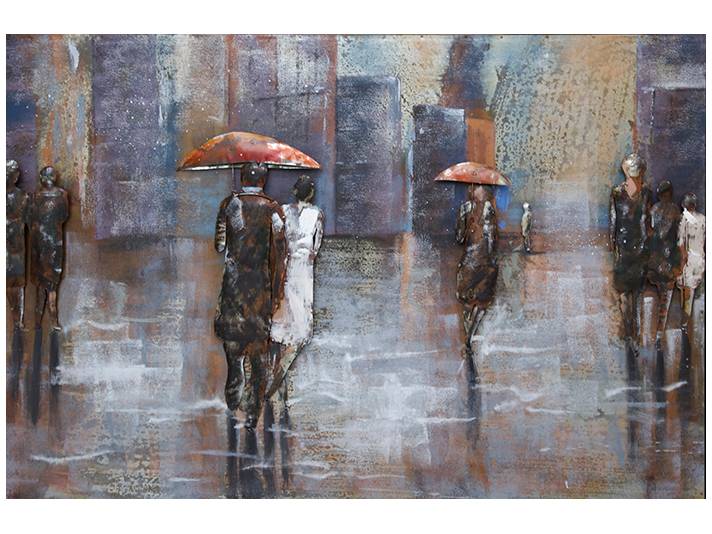 Sfeervolle metalen wanddecoratie. Met de hand gemaakt en beschilderd in passende kleuren. Door het werken met meerdere lagen metaal krijgt dit schilderij diepte. Een soort 3D effect.