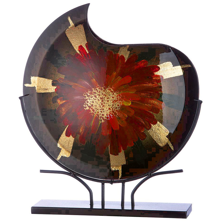 Grote design vaas uit de "Glass-Art" collectie van het Duitse merk Gilde. Prachtig vormgegeven glaswerk in een mat zwarte metalen houder. Dit grote model uit de 'Doré' serie is aan de binnenzijde beschilderd met een grote bloem. Uitgevoerd in verschillende roodtinten op een donkere ondergrond met gouden elementen.