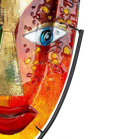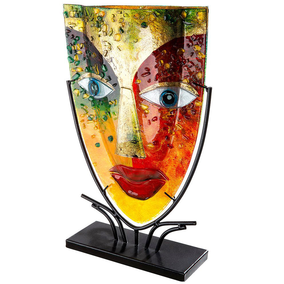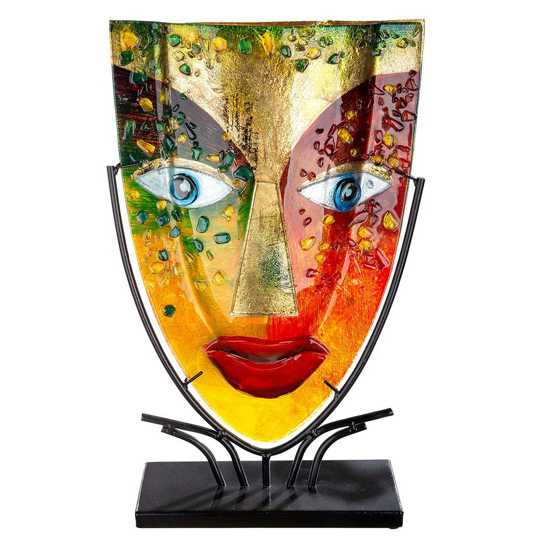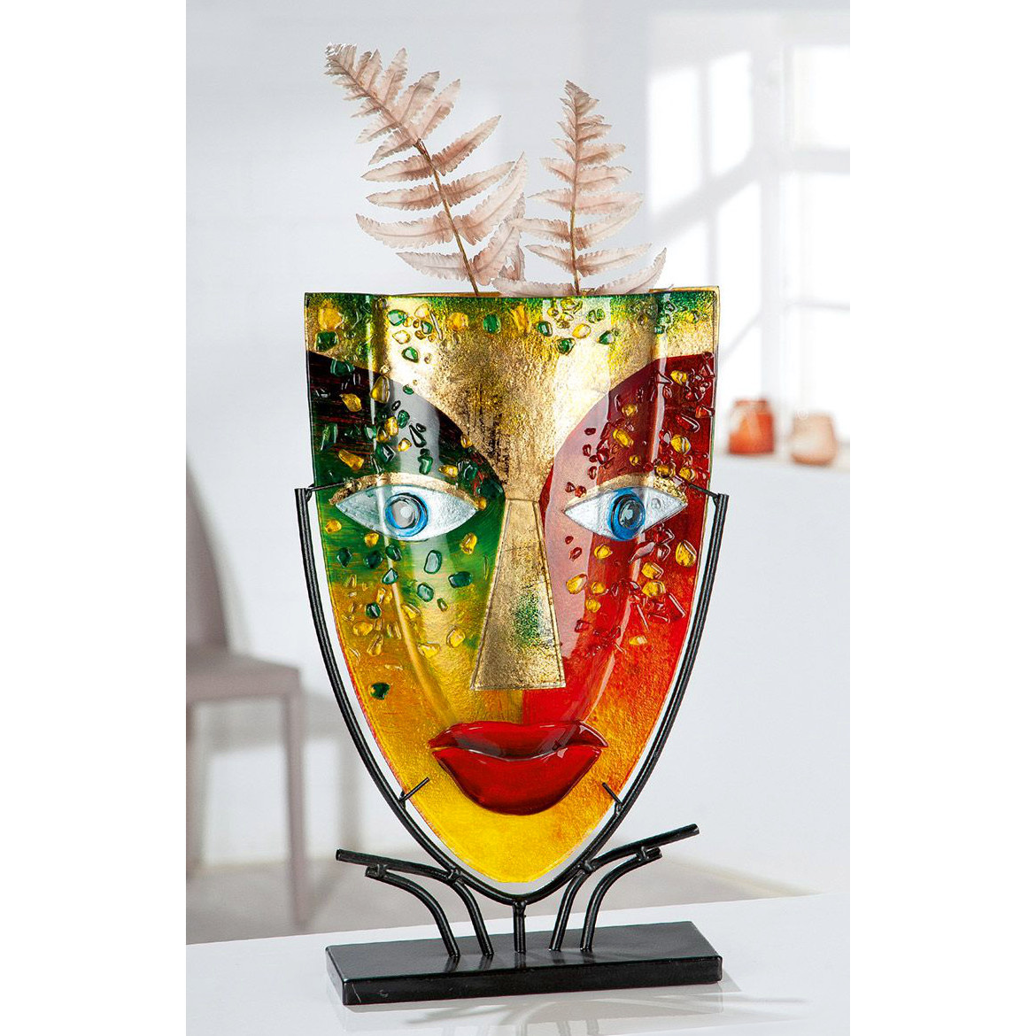 Design vaas uit de 'Glass-Art' collectie van het Duitse merk Gilde. Deze kunstzinnige gezichtsvaas staat in een sierlijke houder van mat zwart metaal. Zijn vorm is bijzonder te noemen, evenals zijn decoratie. Het gezicht op de vaas is met de hand beschilderd en samengesteld met behulp van glasfusing techniek. Dit zorgt voor een creatief object met atelier uitstraling. Spraakmakend als cadeau en een blikvanger voor thuis. Mede door zijn afmetingen is de vaas ideaal voor in een vensterbank, want ook het licht schijnt er dan prachtig doorheen.