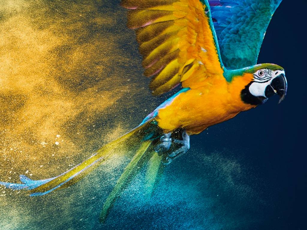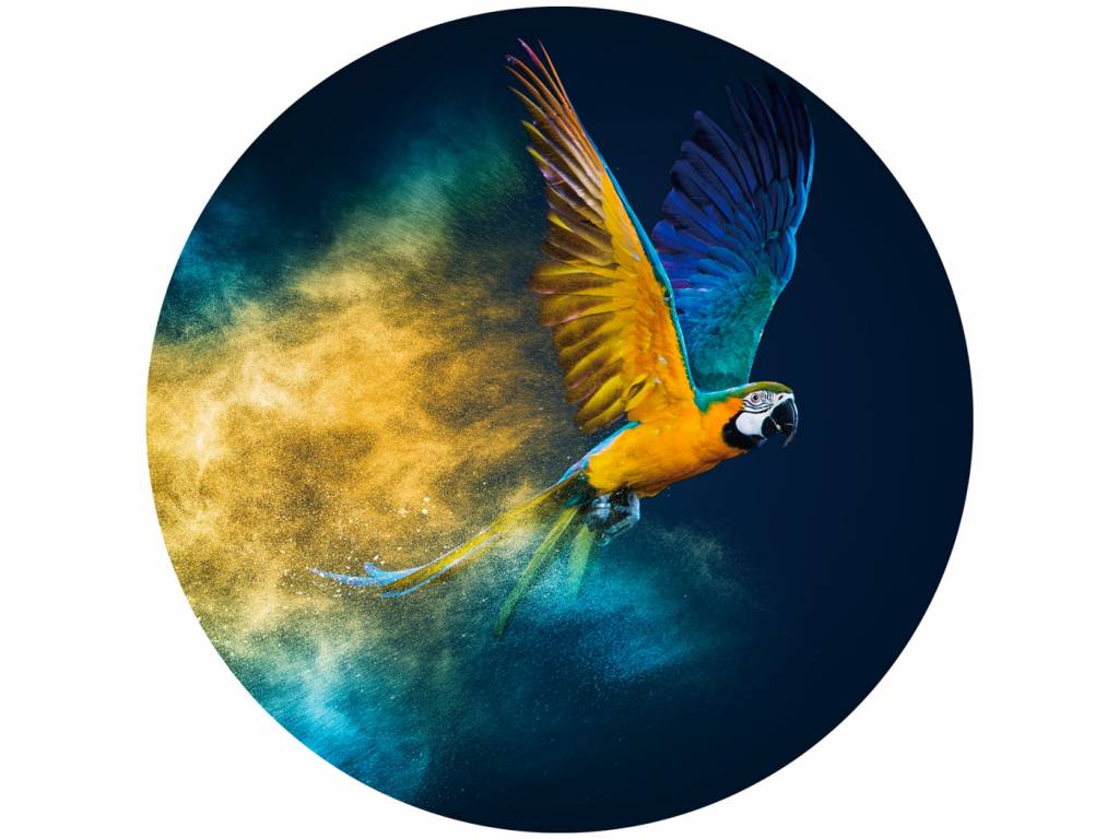 Grote ronde wanddecoratie van glas. Aan de achterzijde van het glas is een schitterende vliegende papegaai te zien. Ogenschijnlijk lijkt het of hij zo uit een blik verf komt vliegen. Een prachtige kleurrijke voorstelling. De ronde glasplaat wordt met kleine beugeltjes aan de muur bevestigd.