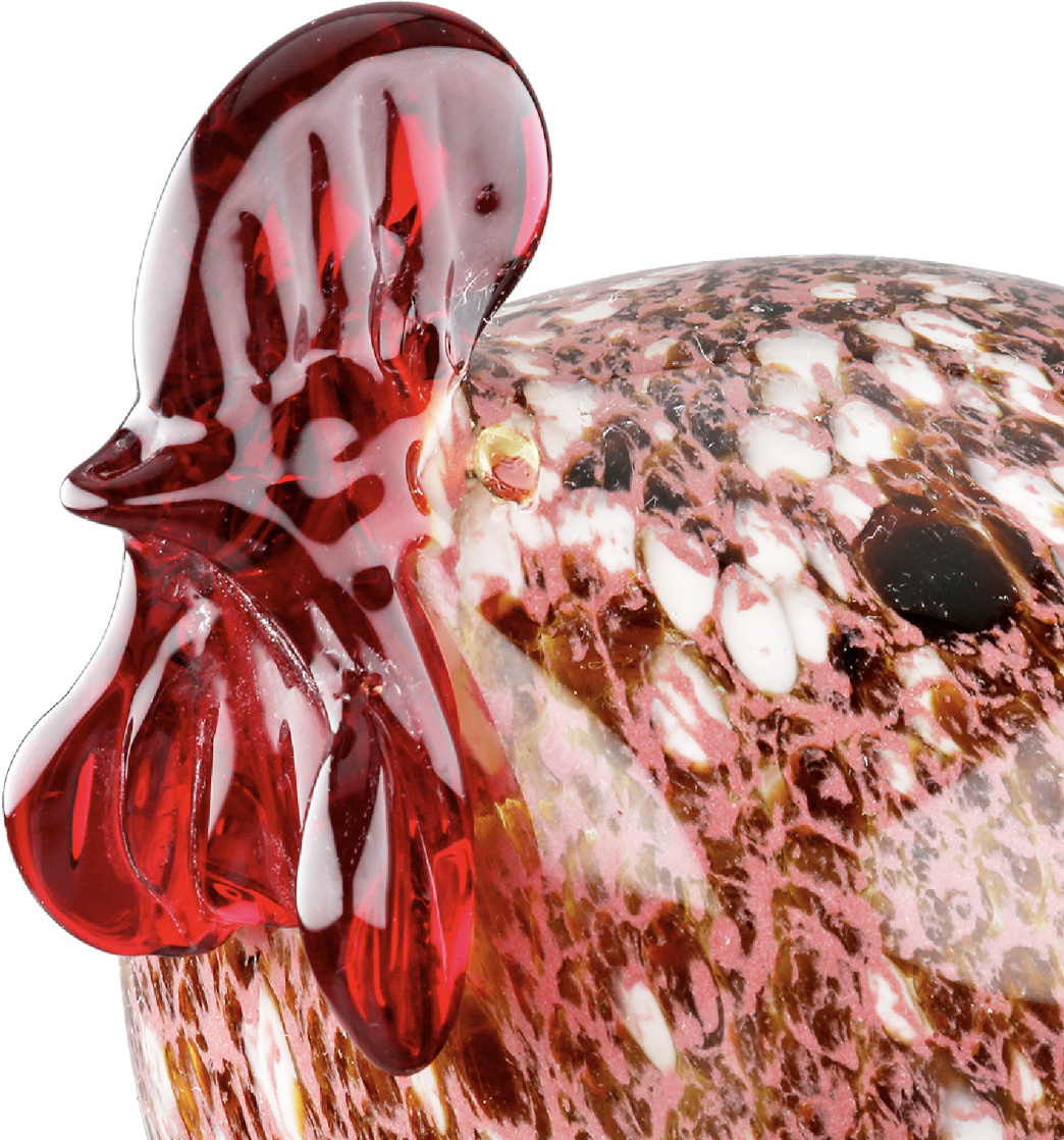 Decoratief sculptuur van glas. Of ze nu aan het broeden is of even een pauze neemt, ze zit er lekker rustig bij. Met haar mooi opvallend rood en roze gekleurde veren met grote rode lellen. Zeer decoratief in een kast, op een plank of op je dressoir.