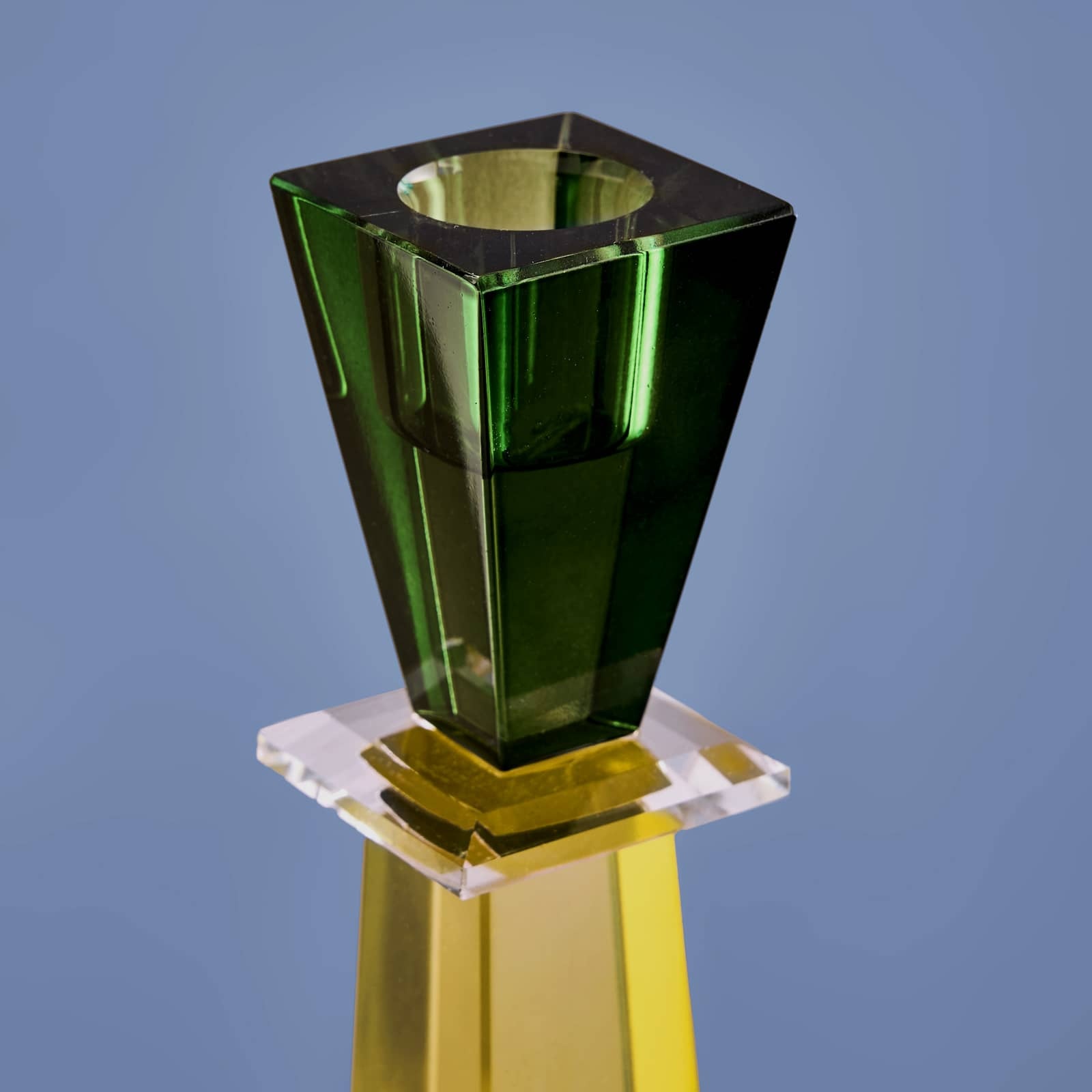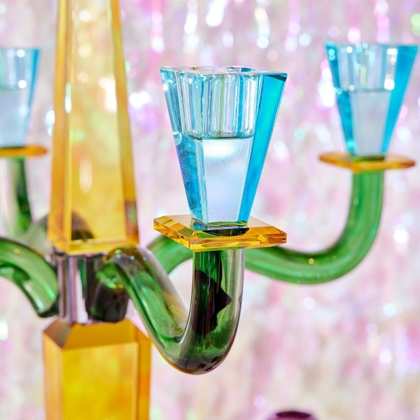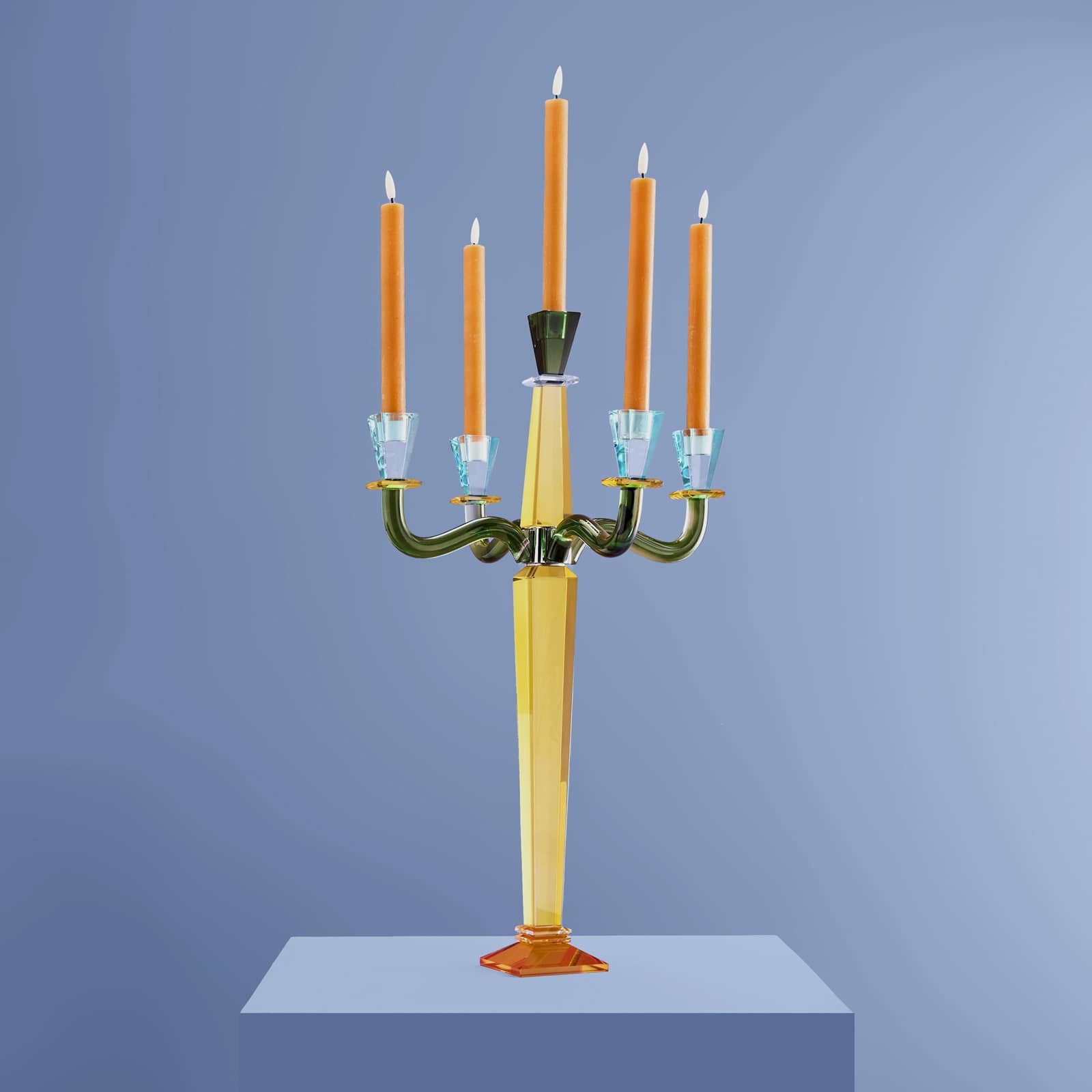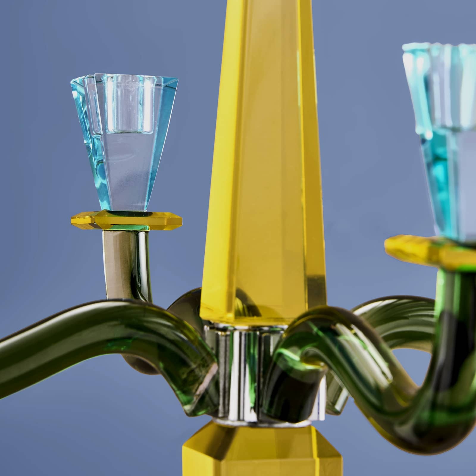 Een kandelaar voor de kleur en design liefhebber. Opvallend mooi door zijn grote formaat van maar liefst 60 cm hoog en zijn elegante vormen. Afgemaakt in de kleuren geel, groen, lichtblauw en rood. Een kaarsen standaard die er zeker mag zijn. Of je nu een strak, bont of kleurrijk interieur hebt, deze kandelaar steekt er prachtig boven uit!