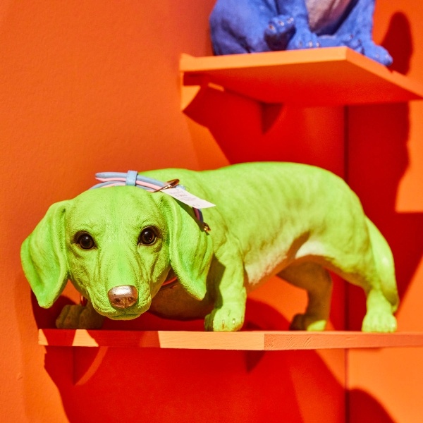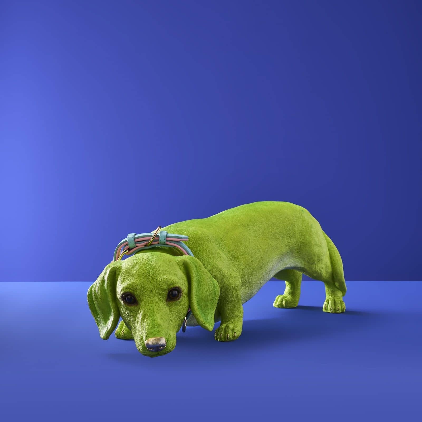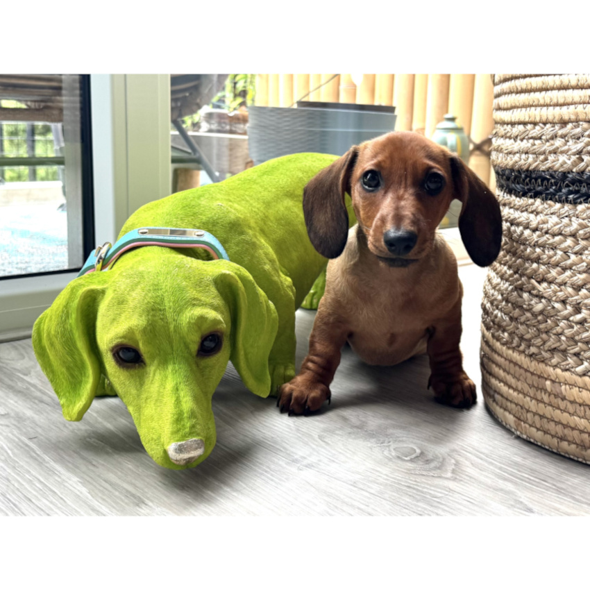 Deze teckel is met recht een opvallende verschijning te noemen. Met zijn gifgroene uiterlijk en helblauwe halsband kun je niet om hem heen! Een uniek decoratie object waar voor de echte teckel liefhebber altijd wel een plekje voor te vinden is.