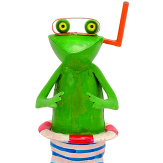 Grote staande kikker gekleed in een vrolijke blauw/wit gestreepte zwembroek. Hij draagt een duikbril met snorkel en heeft een rood/witte zwemband om. Kortom, hij is helemaal klaar om naar het strand te gaan!