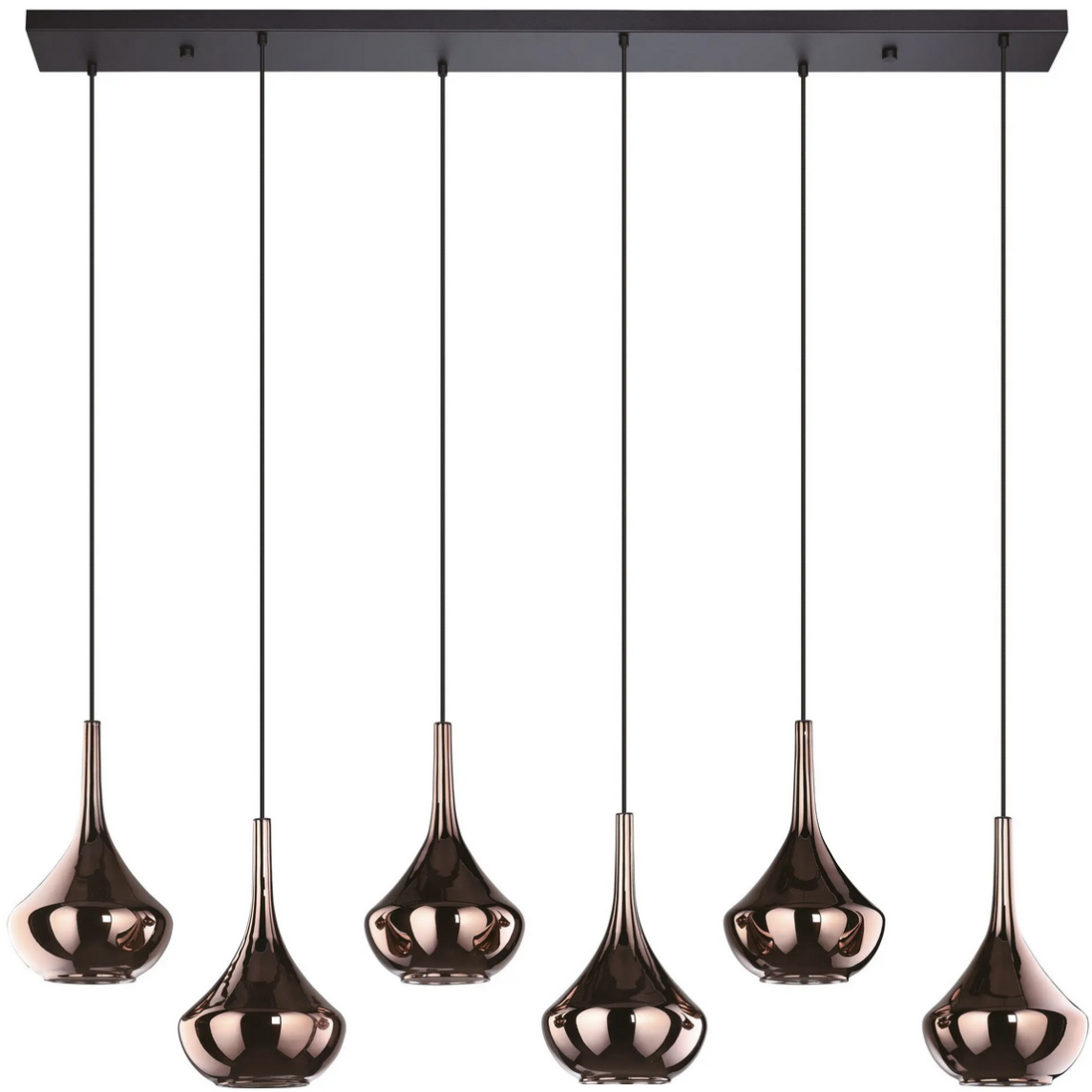 Luxe 6-lichts hanglamp uit de Almoster serie van Eglo. De 320 cm lange mat zwarte balk is perfect voor boven een lange tafel. Aan de balk hangen 6 in hoogte verstelbare glazen "kapjes". Het buitenste glas valt op door een chique koperen tint en een gespiegeld oppervlak, wat zorgt voor een luxueuze uitstraling. Het ontwerp bestaat uit twee samengesmolten glazen. Pas wanneer de lamp wordt ingeschakeld, komt het binnenste glas tevoorschijn, dat dankzij zijn opaline oppervlak verblindingsvrij licht geeft. Ideaal licht om bij te lezen maar ook voor de juiste sfeer. De lamp heeft een elegante uitstraling, waarbij het koperkleurige glas een chique sfeer geeft. Het is een unieke, functionele, decoratieve en sfeervolle lamp.