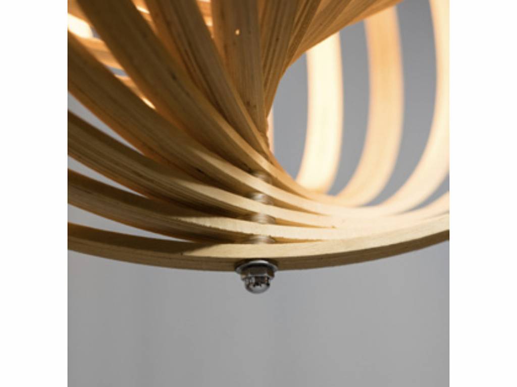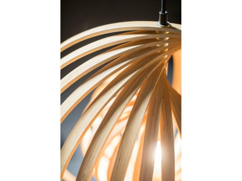 Bijzondere hanglamp met 10 afzonderlijk verstelbare houten ringen. Hierdoor ontstaat een prachtig optisch effect en kan je de lamp steeds weer een ander uiterlijk geven. De lamp hangt aan een zwart armatuur met zwart textielsnoer. Een moderne, tijdloze lamp met natuurlijke uitstraling.