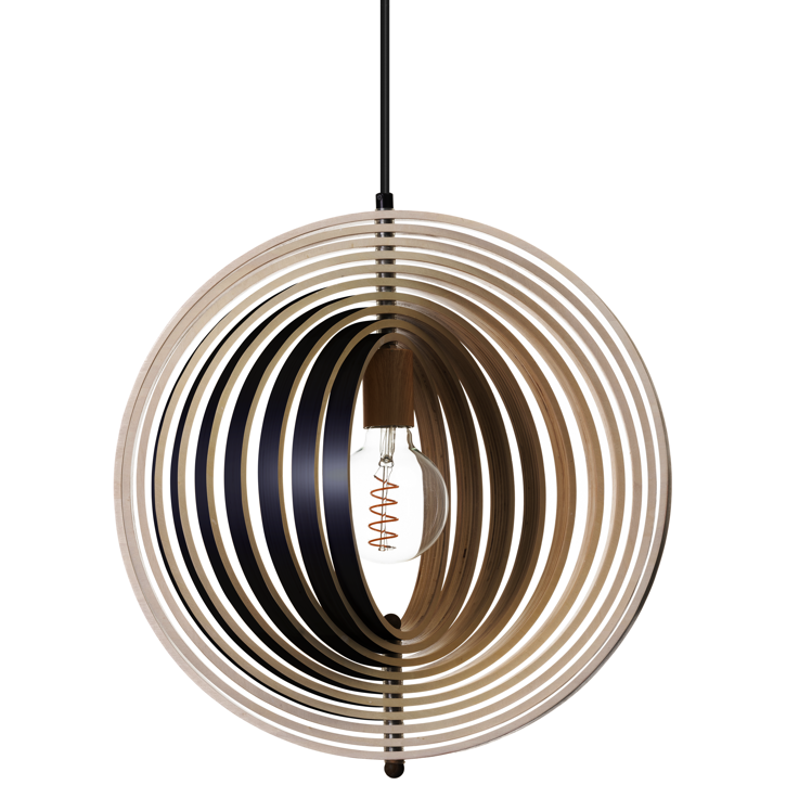 Bijzondere hanglamp met 10 afzonderlijk verstelbare houten ringen. Hierdoor ontstaat een prachtig optisch effect en kan je de lamp steeds weer een ander uiterlijk geven. De lamp heeft aan de buitenkant van de houten ringen een zwarte kleur met aan de binnenkant naturel hout. Hij hangt aan een zwart armatuur met zwart textielsnoer. Een moderne, tijdloze lamp met natuurlijke uitstraling.