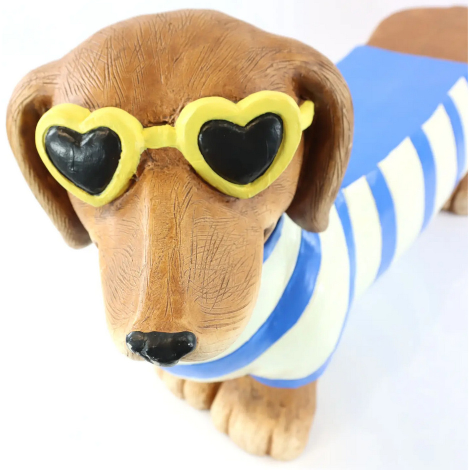 Grappig tuinbankje of tuintafeltje, maar ook een blikvanger op de kinderkamer of in een hoekje in huis als extra tafeltje! Deze zomerse teckel met blauw-wit gestreepte pullover en gele zonnebril is uitgevoerd in kunststof.