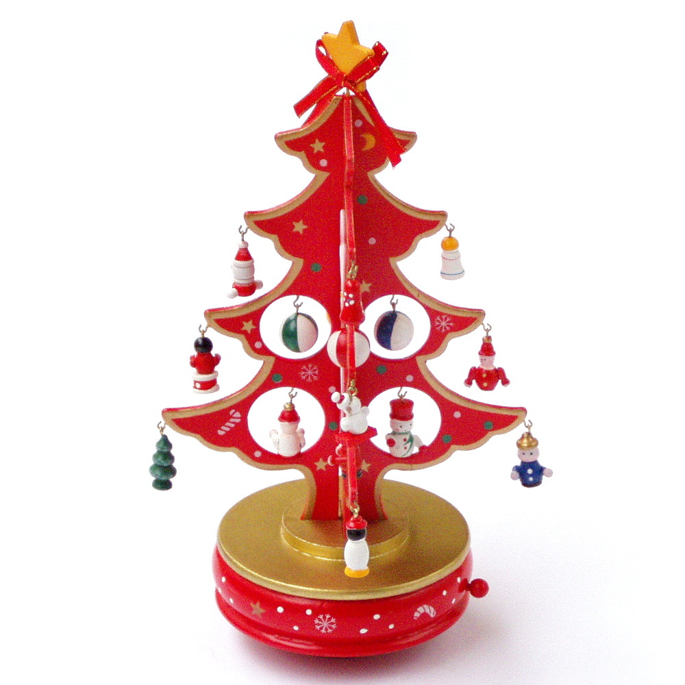 Muziekdoos in de vorm van een houten kerstboom uitgevoerd in rood met goud. De boom heeft 4 zijtakken en in totaal 20 verschillende hangertjes bestaande uit o.a. klokken, ballen, sneeuwpoppen en kerstmannetjes. Ondanks dat er rekening moet worden gehouden met grootte en beschikbare ruimte, kunnen de figuurtjes toch naar eigen inzicht in de boom gehangen worden. Bovenin de kerstboom pronkt een grote gele ster met rode strik.