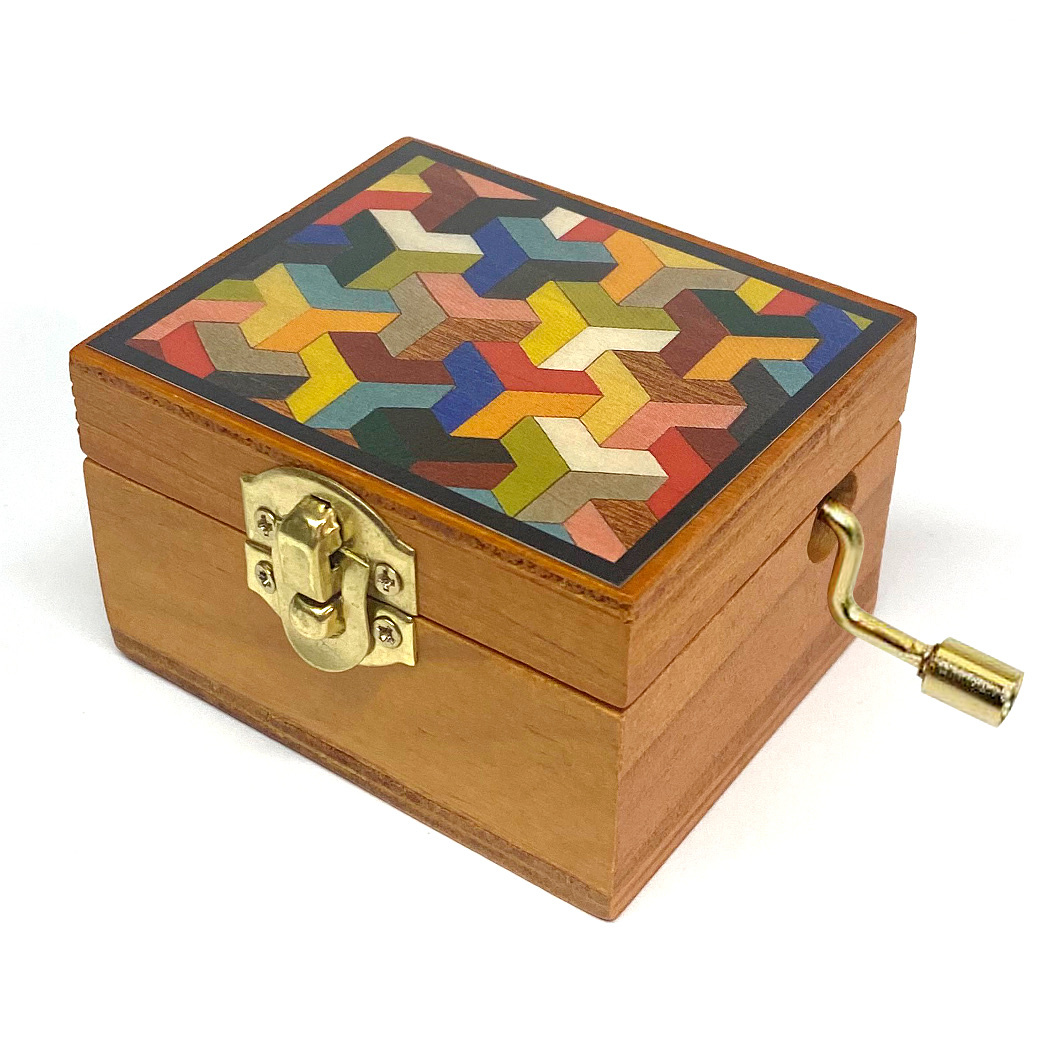 Dit model is voorzien van een moderne afbeelding uit de serie 'Farbigen Intarsien' (Gekleurd inlegwerk). Een prachtig stukje Duits vakmanschap waarbij, door gebruik te maken van diverse soorten hout en verschillende tinten beits, een prachtig decoratief geheel ontstaan. Bij dit exemplaar is een kubistisch 3D motief gecreëerd.