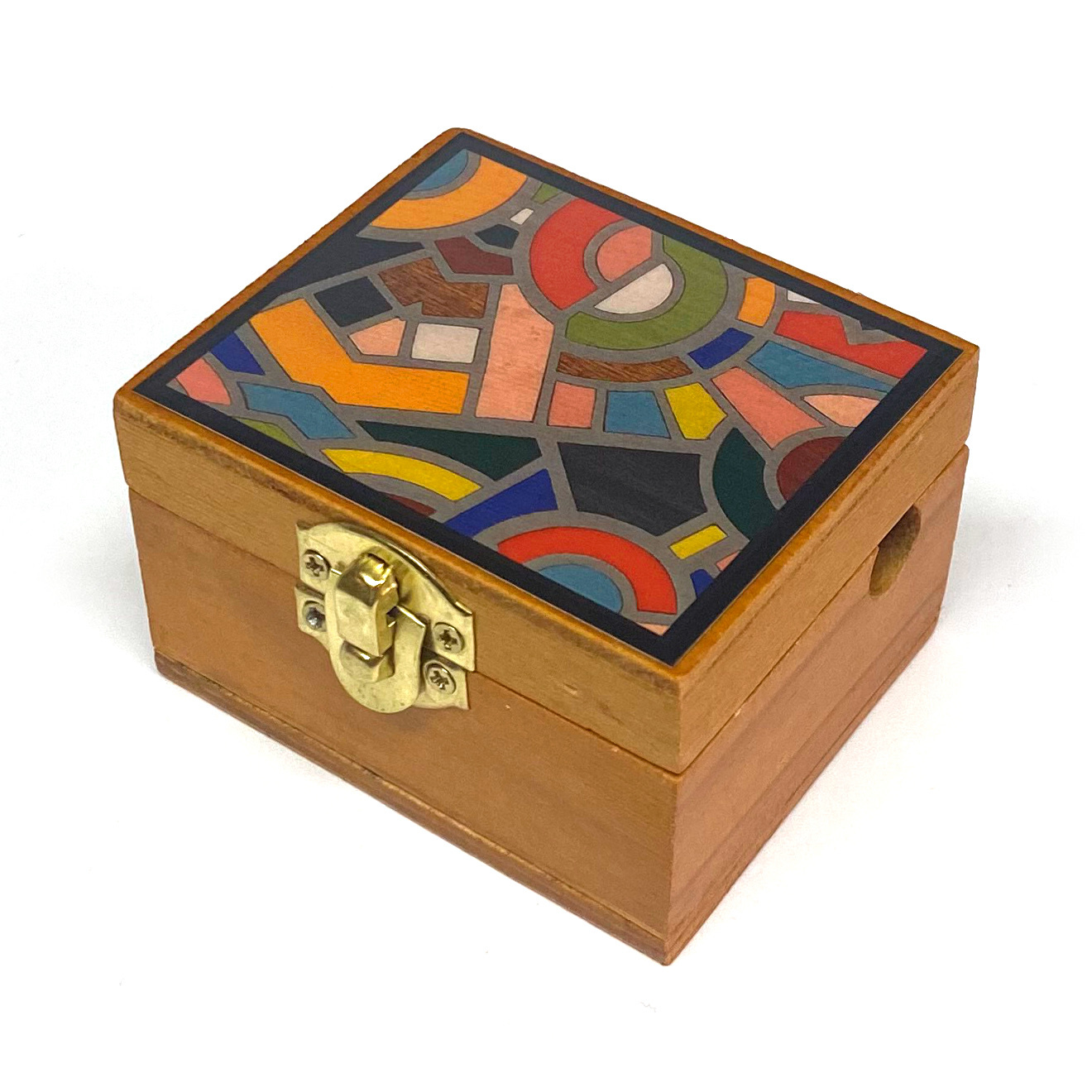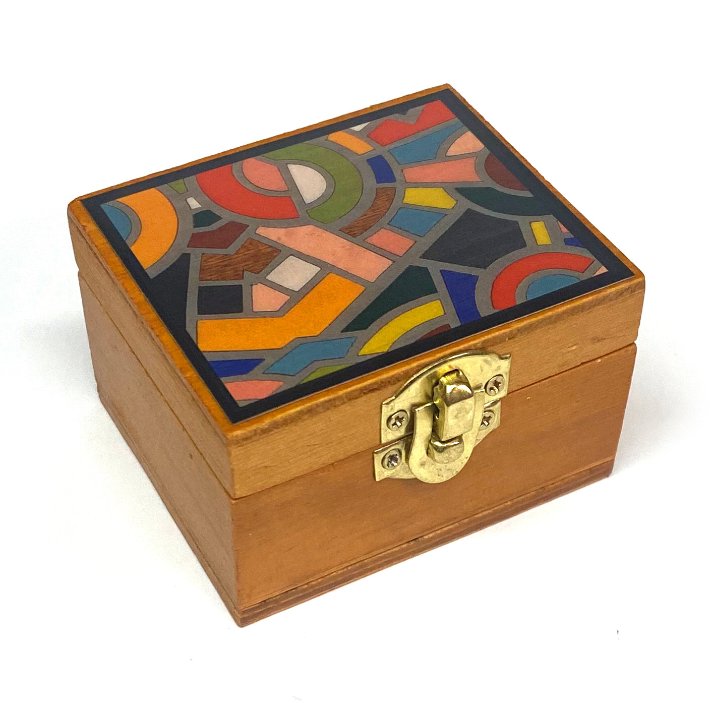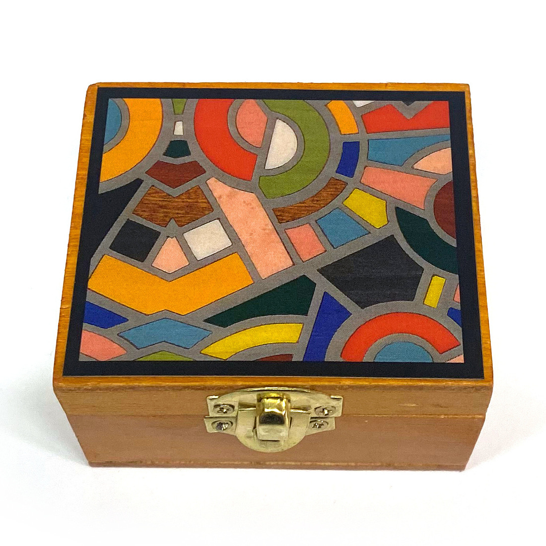 Dit model is voorzien van een moderne afbeelding uit de serie 'Farbigen Intarsien' (Gekleurd inlegwerk). Een prachtig stukje Duits vakmanschap waarbij, door gebruik te maken van diverse soorten hout en verschillende tinten beits, een prachtig decoratief geheel ontstaan. Bij dit exemplaar is een kleurrijk glas in lood motief gecreëerd.