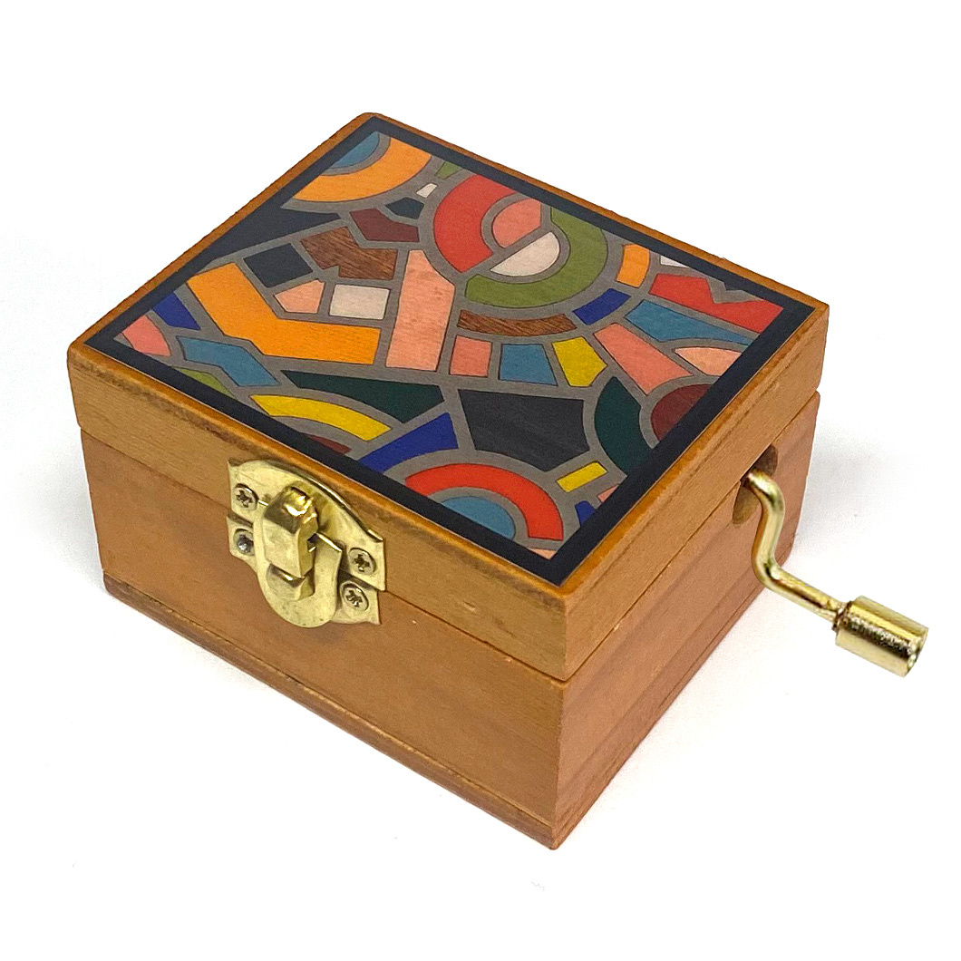 Klein houten kistje, speciaal gemaakt voor een met de hand aangedreven muziekdoosje. Uitgevoerd in honingkleurig mahoniehout met goudkleurig metalen beslag. Het kistje heeft aan de rechterzijde een ronde opening voor de slinger zodat je de melodie met gesloten deksel kunt laten horen.