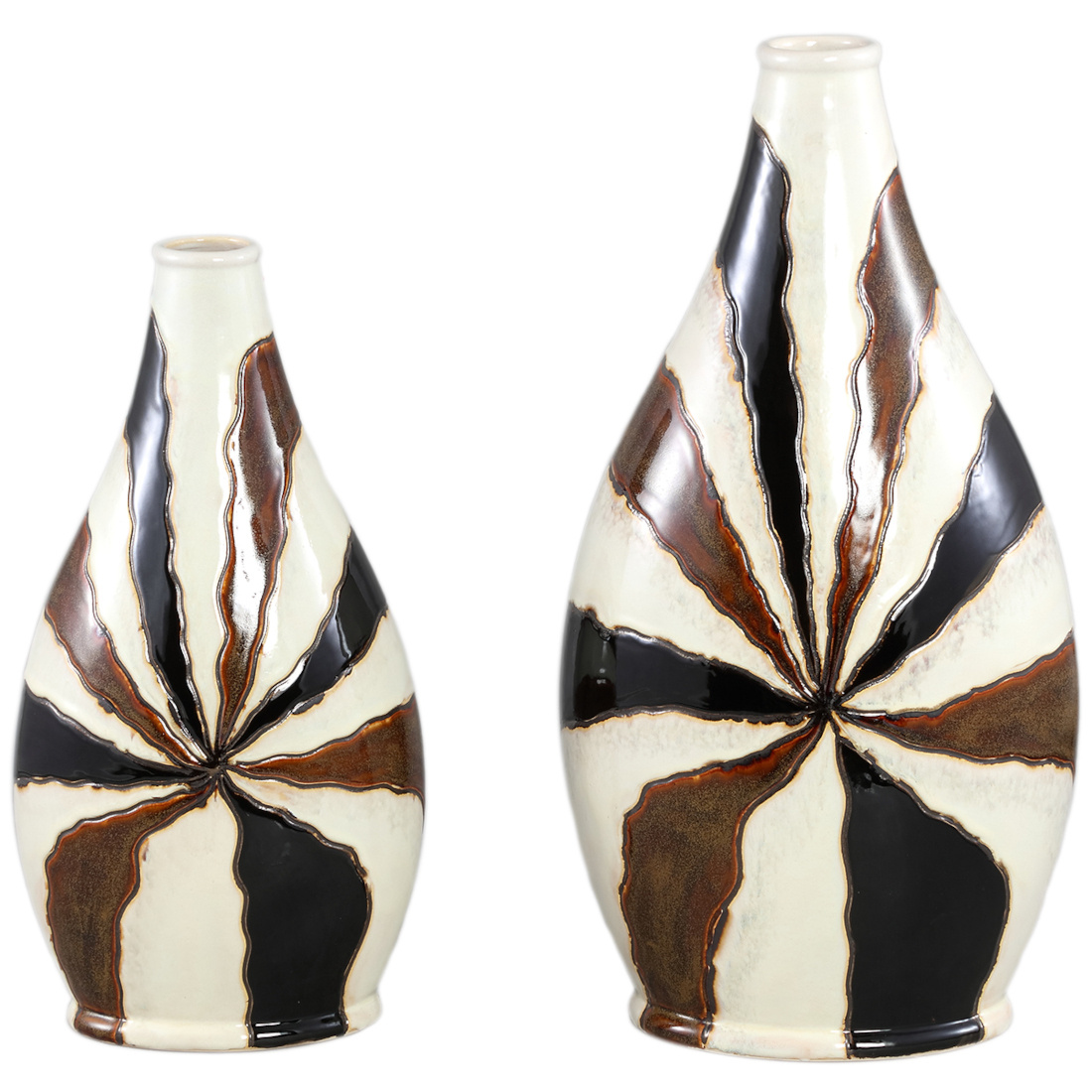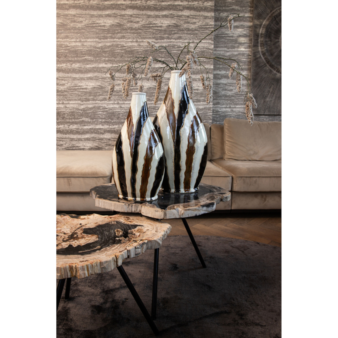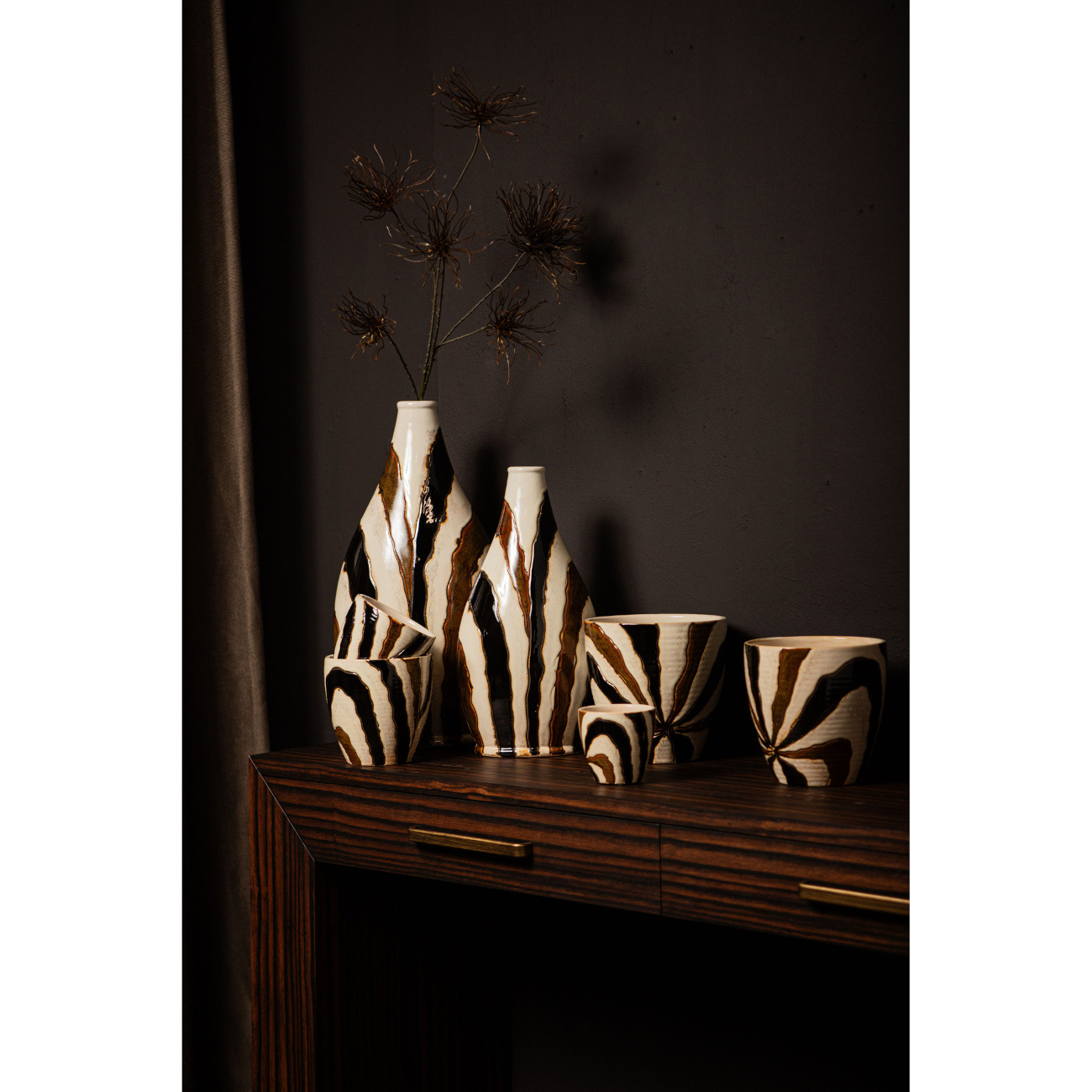 Zeker een mooie aandachttrekker in een open kast of op een dressoir. Deze aardewerk vaas is gedecoreerd met een golvende lijn print. De vaas is wit van kleur met donker en licht bruinen lijnen. Door de rustige kleur combinatie en het bijzondere model staat het erg mooi in een strak interieur.