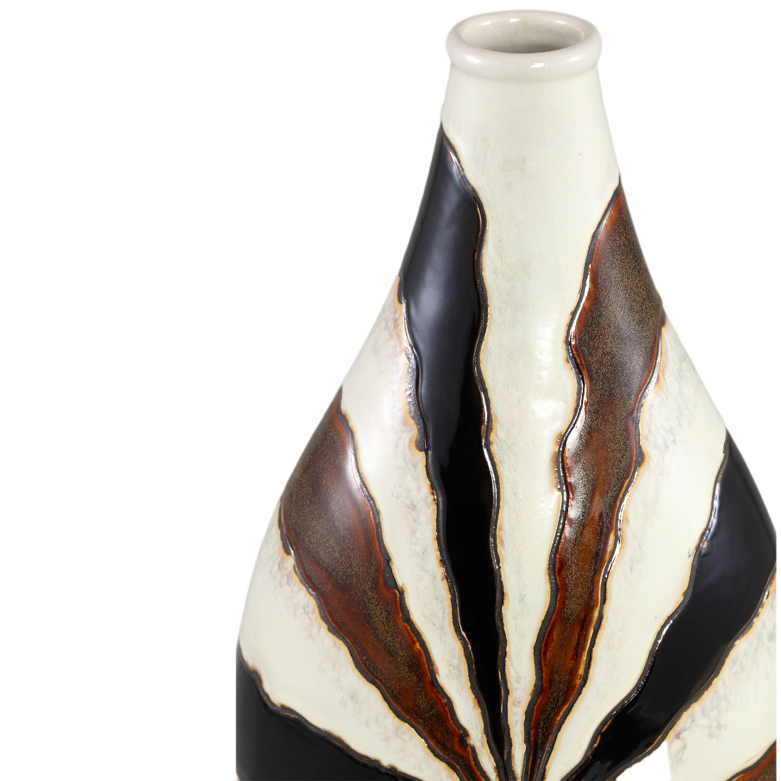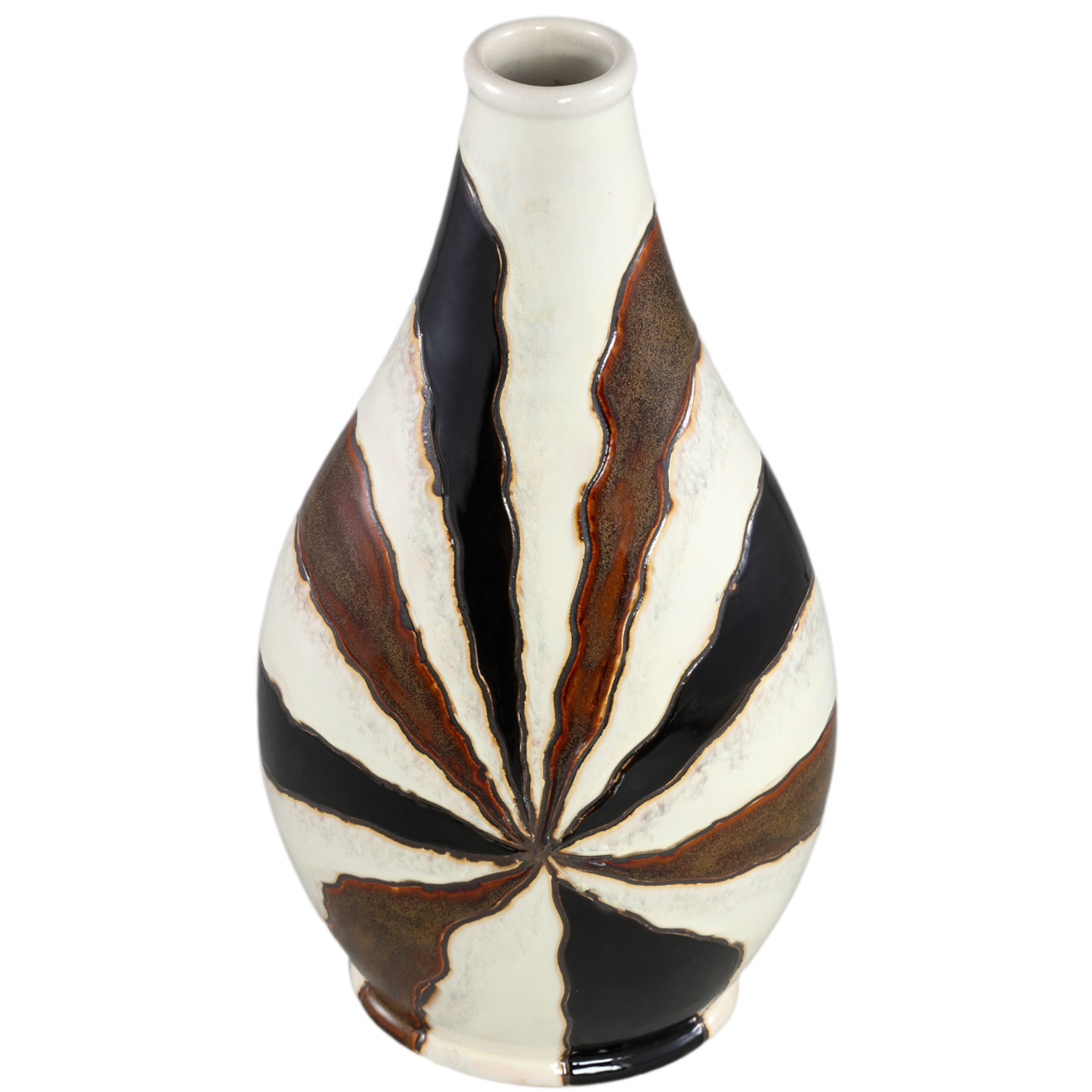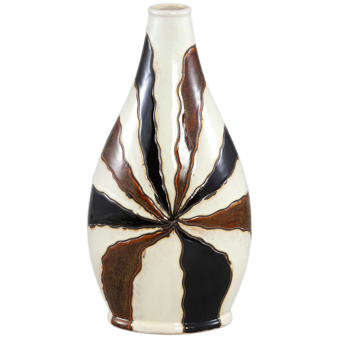 Zeker een mooie aandachttrekker in een open kast of op een dressoir. Deze aardewerk vaas is gedecoreerd met een golvende lijn print. De vaas is wit van kleur met donker en licht bruinen lijnen. Door de rustige kleur combinatie en het bijzondere model staat het erg mooi in een strak interieur.