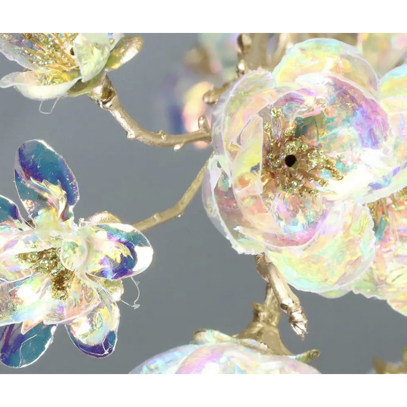 Decoratieve kunsttak in het goud met drie verschillende bloemen. De bloemen zijn iriserend hierdoor heeft het een optisch effect waarbij de bloemen regenboogkleuren tonen die veranderen afhankelijk van de kijkhoek. Voor extra kleur en een bijzondere touch voor in je interieur!